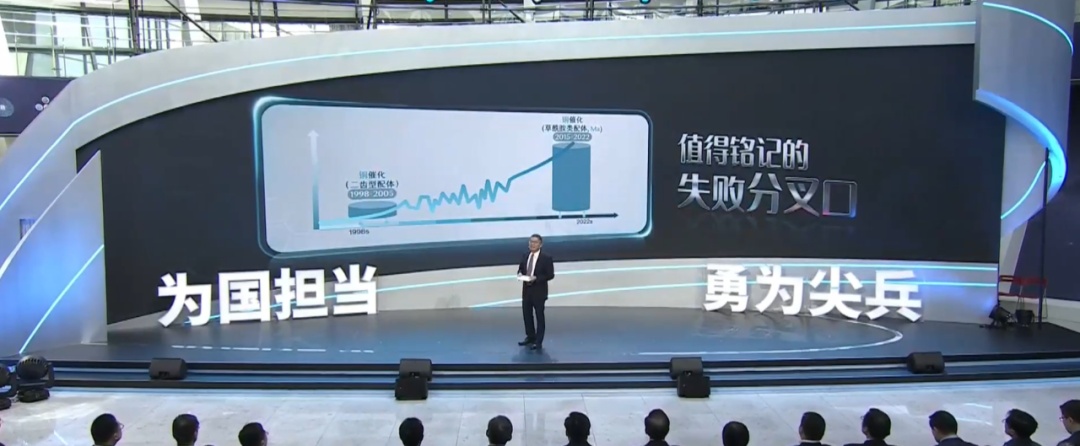 说到这里,我想请大家看一条曲线,这是第一代配体到第二代配体的活力曲线,这条“漂亮”上扬弧度,意味着催化效率获得了百倍的提升。而我更关注这条弧线上的每一个失败的分叉口。