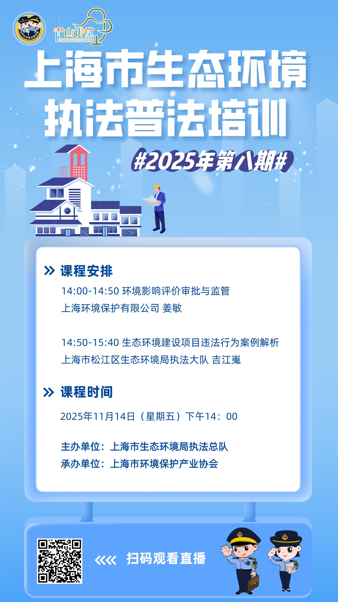当前,建设项目环境管理正面临深刻的变革,环保法律法规体系日趋严密,环境执法力度持续加大,企业环境违法成本显著提高。然而,在实践中,许多建设单位和管理人员仍存在环境责任意识淡薄、对制度理解不深、执行不到位的问题。为进一步强化普法宣传,引导企业增强守法意识,履行建设项目从环评、建设到运营的全过程管理义务,由上海市生态环境局执法总队主办、上海市环境保护产业协会承办的2025年第八期生态环境执法普法培训即将开班。