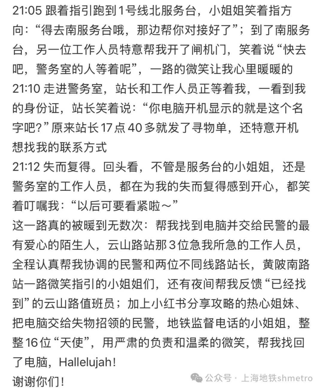 上海地铁对此次事件表示高度关注,并由衷感谢乘客在失物寻回过程中进行的暖心记录。上海地铁相关负责人称,对于3小时内找回电脑这一成果感到十分欣慰,这离不开云山路站、蓝天路站及黄陂南路站工作人员、民警以及地铁服务热线的高效协同配合。同时,也特别感谢那位拾金不昧的乘客,正是他的善举让这件原本曲折的事件有了圆满结局。
