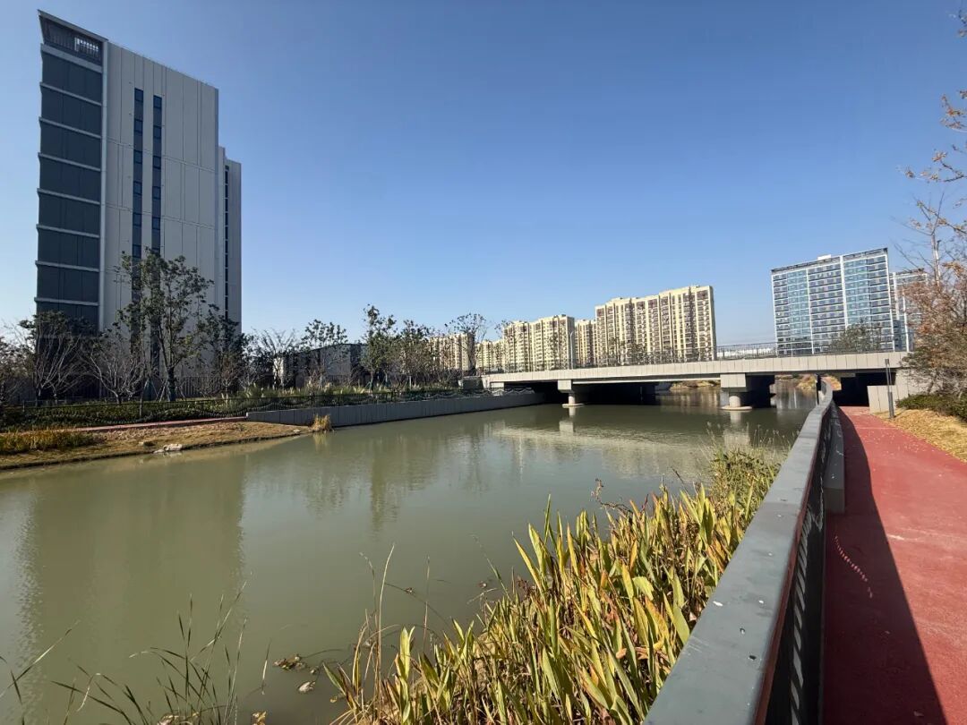 竖河北起西五河,南至银春路,全长349米,项目涵盖新开河道、新建生态护岸、打造防汛通道及绿化景观提升等。如今,澄澈的河水穿城而过,两岸新植的树木依次排开,红色塑胶步道如丝带般沿堤岸伸展开来。沿河一侧种植了错落的芦苇和水草,步道上偶见居民慢行。此次整治不仅完成了水质清淤、驳岸加固,也植入了“亲水+便民”的景观设计。