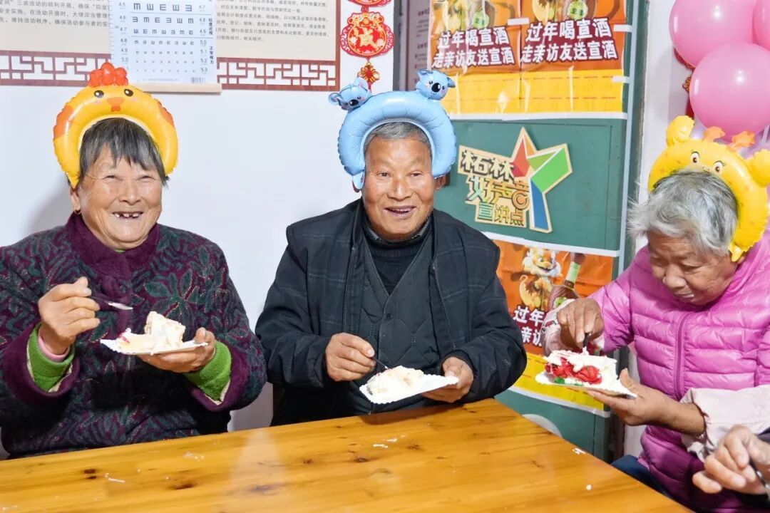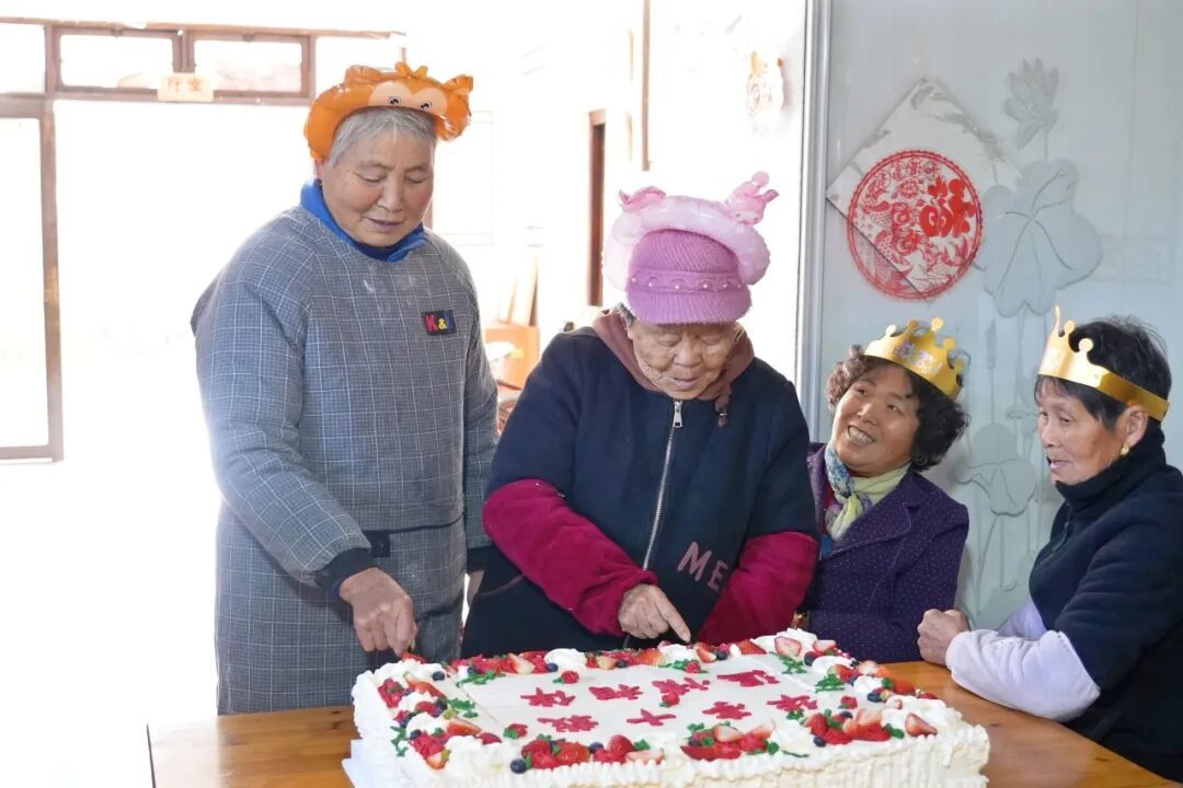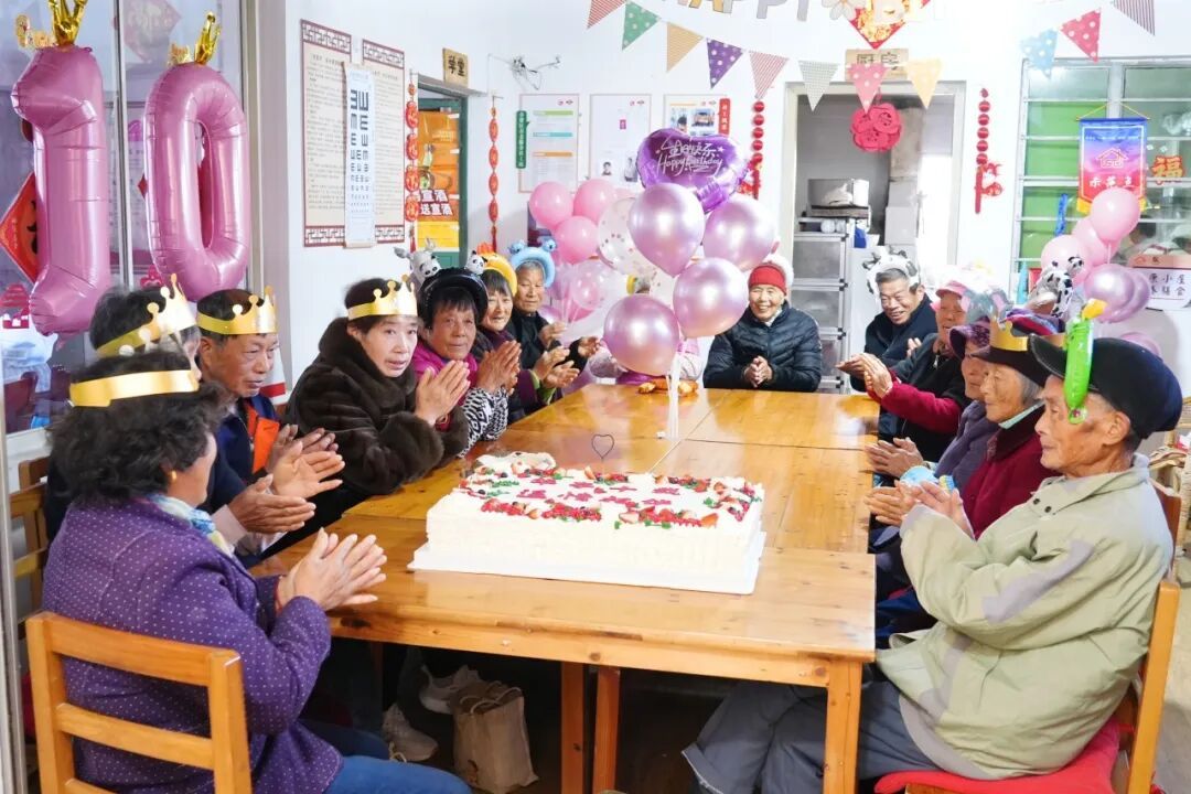 现场,老人们头戴精致卡通发箍,笑容灿烂、精神矍铄,围坐在一起唠家常、话过往。工作人员则早早备好了庆生蛋糕与长寿面,与老人们一同切蛋糕、品寿面,暖心话语伴着阵阵欢笑,满是幸福的滋味。今年87岁的吴水英阿婆,自2019年起便在睦邻点就餐,她说:“我在这儿吃饭整整七年,饭菜合自己的口味,吃得舒心。睦邻点离我家不远,走路五分钟就到,特别方便。平时除了吃饭,这里还会办活动,我有空就来参加的。今天和大家一起为睦邻点庆生吃蛋糕,特别开心。”