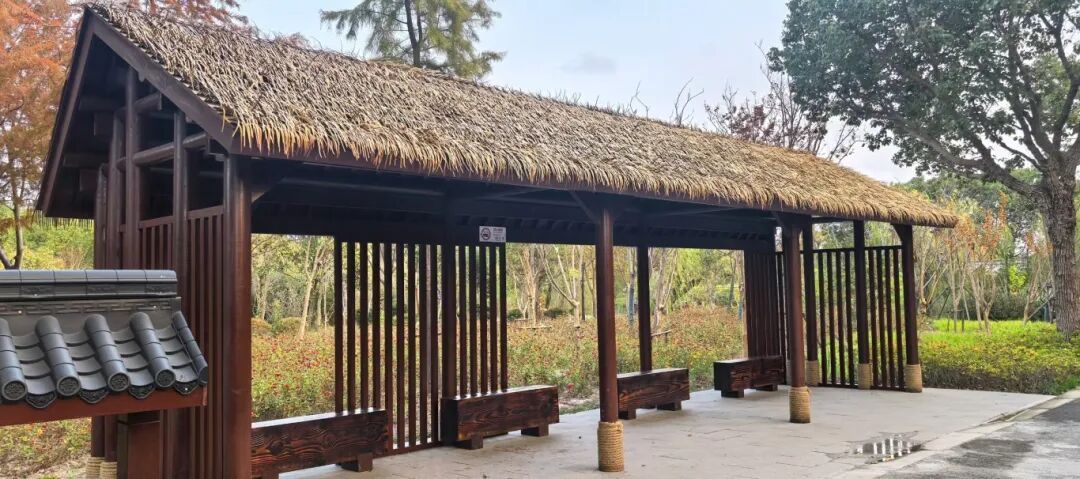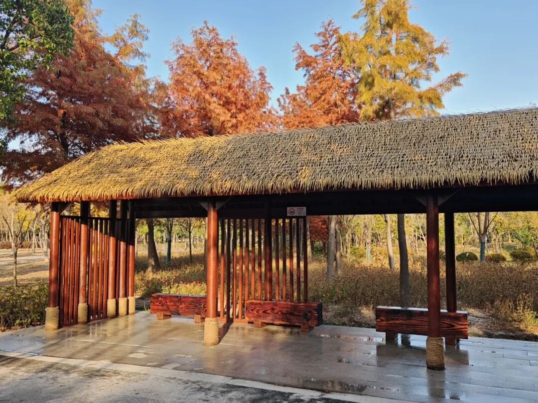 合庆郊野公园的茅草亭,是秋日里一处别致的歇脚地。它以质朴的木质结构搭配天然茅草顶,与身后层林尽染的红杉林相映成趣。亭内的石地光洁、木凳温润,在此暂歇,既能躲开秋日的暖阳,又能静静聆听风吹过杉林的簌簌声响,感受郊野自然的温柔与惬意。