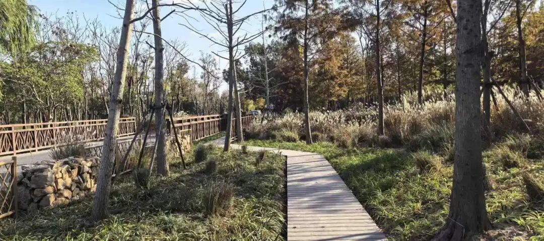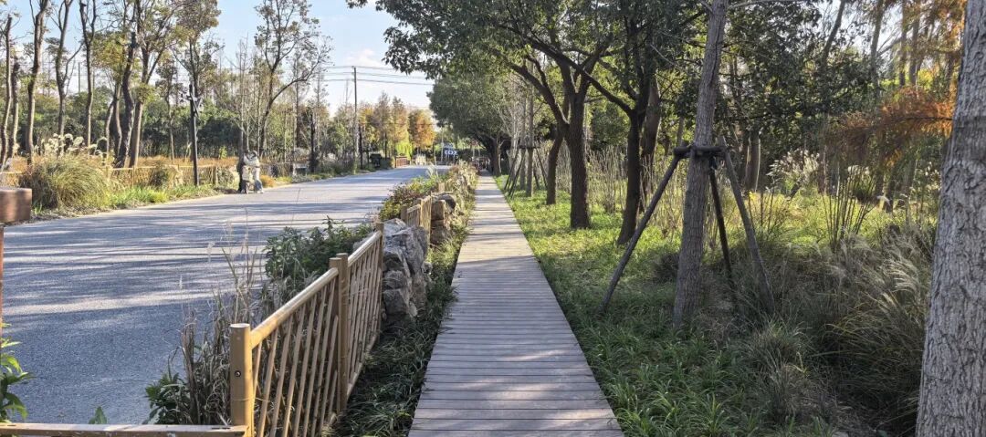 为确保游客安全,合庆郊野公园并未进行大规模道路改建,而是因地制宜,在现有市政道路旁铺设独立的低干扰木栈道。既实现了人车分流,又使游览动线无缝衔接于自然景观之中。