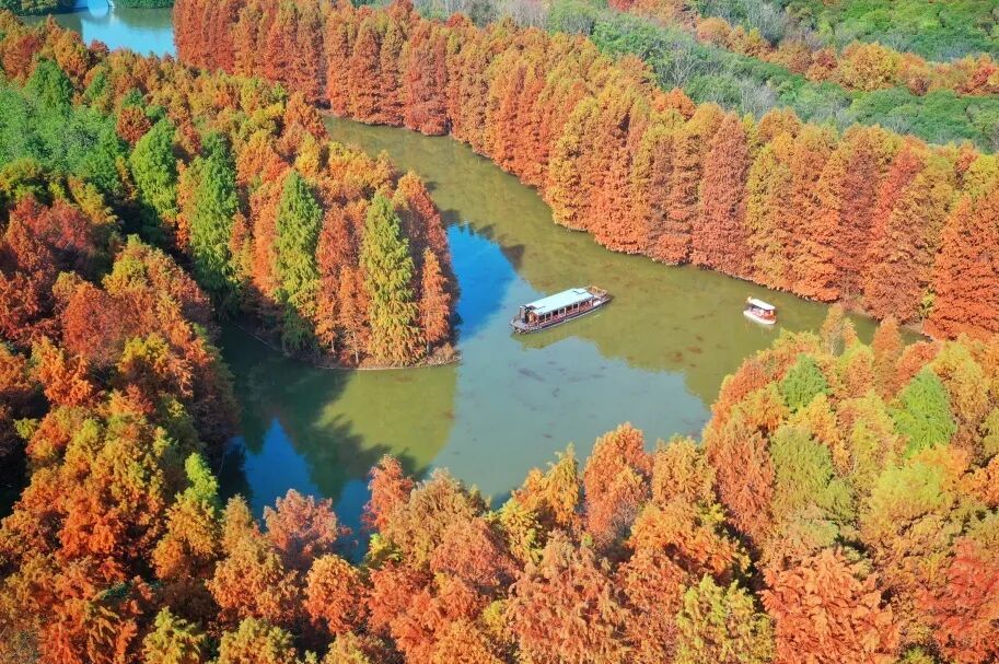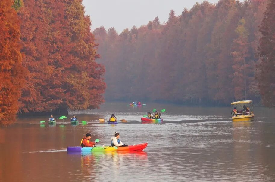 除步行外,游客还可乘船悠然入林,享受深秋的恬静。虽然电动船暂未开放进入核心林区,但人力驱动的脚踏船和平台舟,反而让游览多了份悠闲与宁静,只听见桨橹划水声与林间的鸟鸣。无论是悠闲的脚踏船还是灵巧的平台舟,都以最安静的方式滑入林间水巷,耳畔只余桨声与鸟鸣,别有一番意境。王帅建议,若遇游船等候,不妨先沿栈道步行赏叶,从不同视角感受林间光影的变幻。