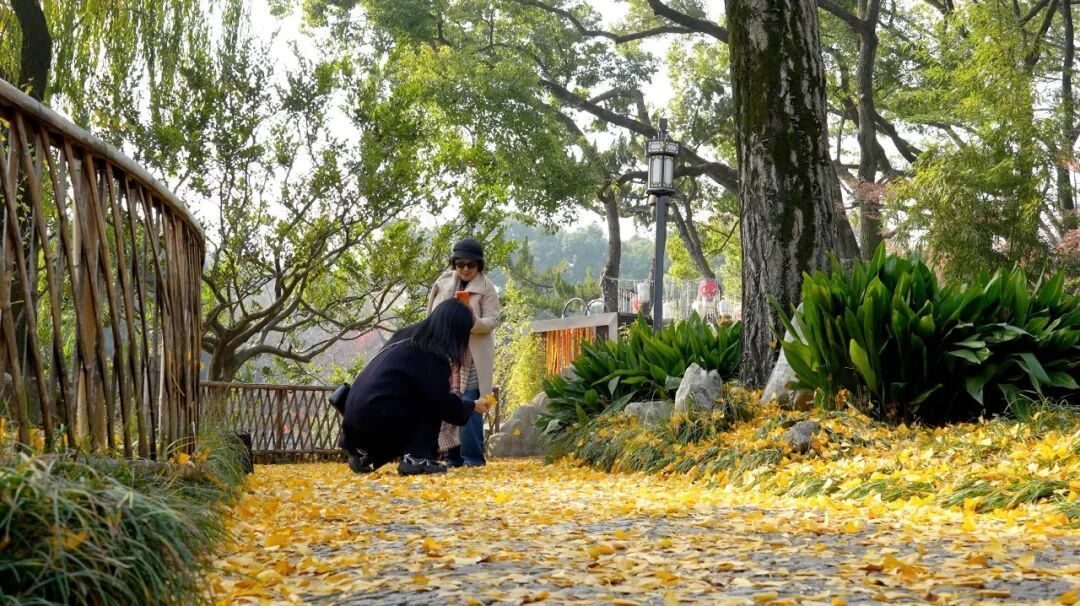 为了丰富游园体验,园方也巧妙地为这份秋冬景致增添了更多观赏细节。水面上的残荷被特意保留,勾勒出别样的线条之美;飘落的银杏叶被归拢成片,铺就一地金黄。这些用心布置,为摄影爱好者与漫步其间的游客,提供了丰富的画面与游园体验。