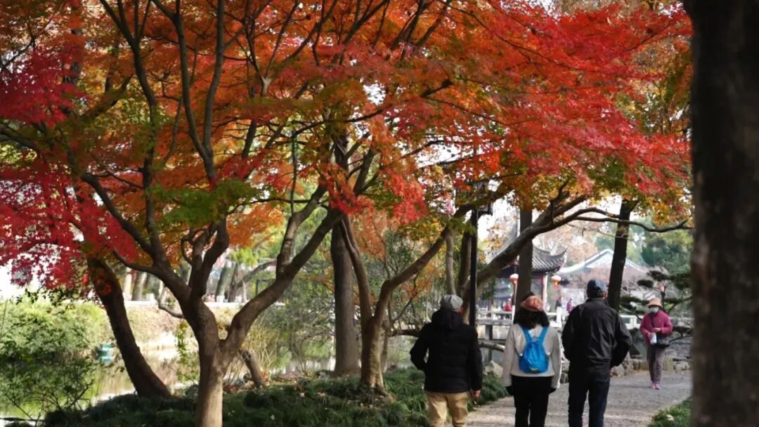 进入12月,嘉定街头寒意渐浓,但上海古猗园里的红枫似火、水杉鎏金,与古典建筑相映成趣,这抹秋冬景色吸引了不少市民前来观赏。
