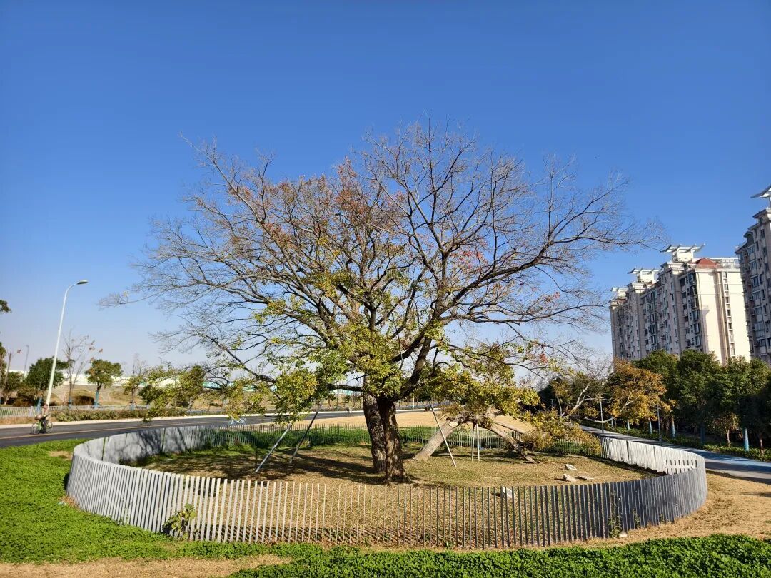 值得一提的是,宝山滨江大道(东林路~盘古路)段还是市民观景的好去处。在这里,不仅可以将浩瀚壮阔的长江口风光揽入视野,还有几乎触手可及的长滩“金箍棒”等地标性建筑,南侧绿化带还有古树名木可供仔细端详。例如,草地上用低矮圆形栅栏围起来的古树“三姐妹”也很有看头:居中的是110年树龄的丝棉木,两边各有一棵80年树龄的朴树,它们相依相伴,姿态万千,仿佛在讲述大半个世纪的乡愁。