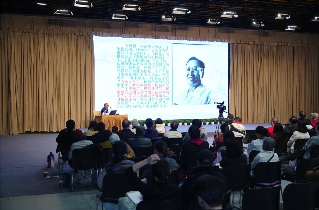 主题演讲剖析了岭南画派的缘起,包括创始人高剑父、高奇峰和陈树人以及传人如关山月、黎雄才、杨善深、赵少昂等人的艺术发展;对岭南画派的界定、发展与演进做了详细论述,解读了岭南画派与广东传统画派的论争,以及岭南画派如何打破传统、融合中西,成为推动中国近现代美术转型的关键力量。通过详实的资料与系统的梳理,朱万章带领观众重新认识了“岭南画派”,他总结道,“岭南画派由传统到折中中西,由革新到融合。在上海、广州和香港以及海外诸地,都出现了‘岭南画派’的生成、发展与多元变革。在不同的历史时期,这一画派也出现过众多艺术名家与不同风格的艺术作品。当我们回顾‘岭南画派’的百年演进,可以感受到这个在南中国地区具有持久影响力的画派的艺术精神与绘画传统。”