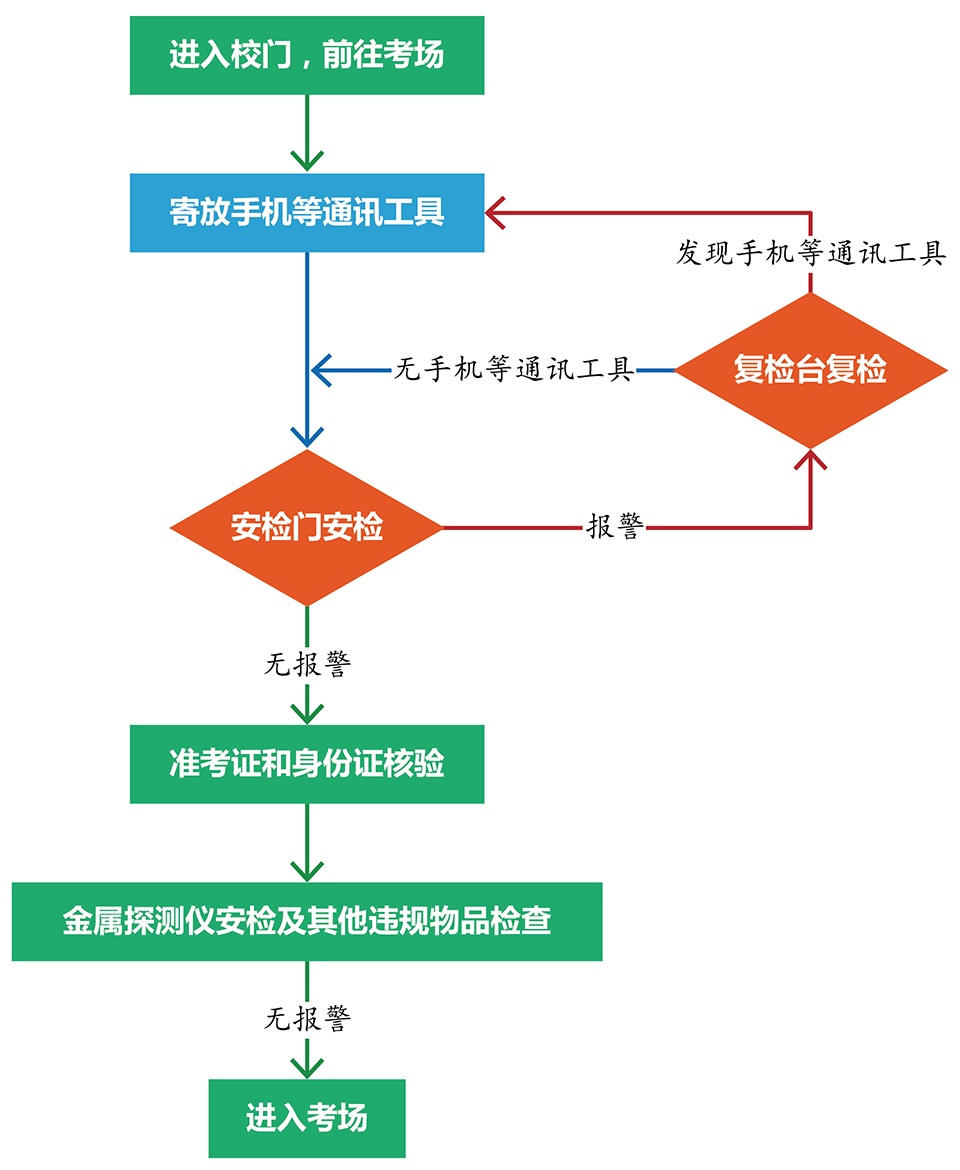 (4)须通过智能安检门安全检测、有效身份证件核验后方可进入教学楼;须通过人工检查和手持金属探测仪安全检测后,方可进入考场(教室)。