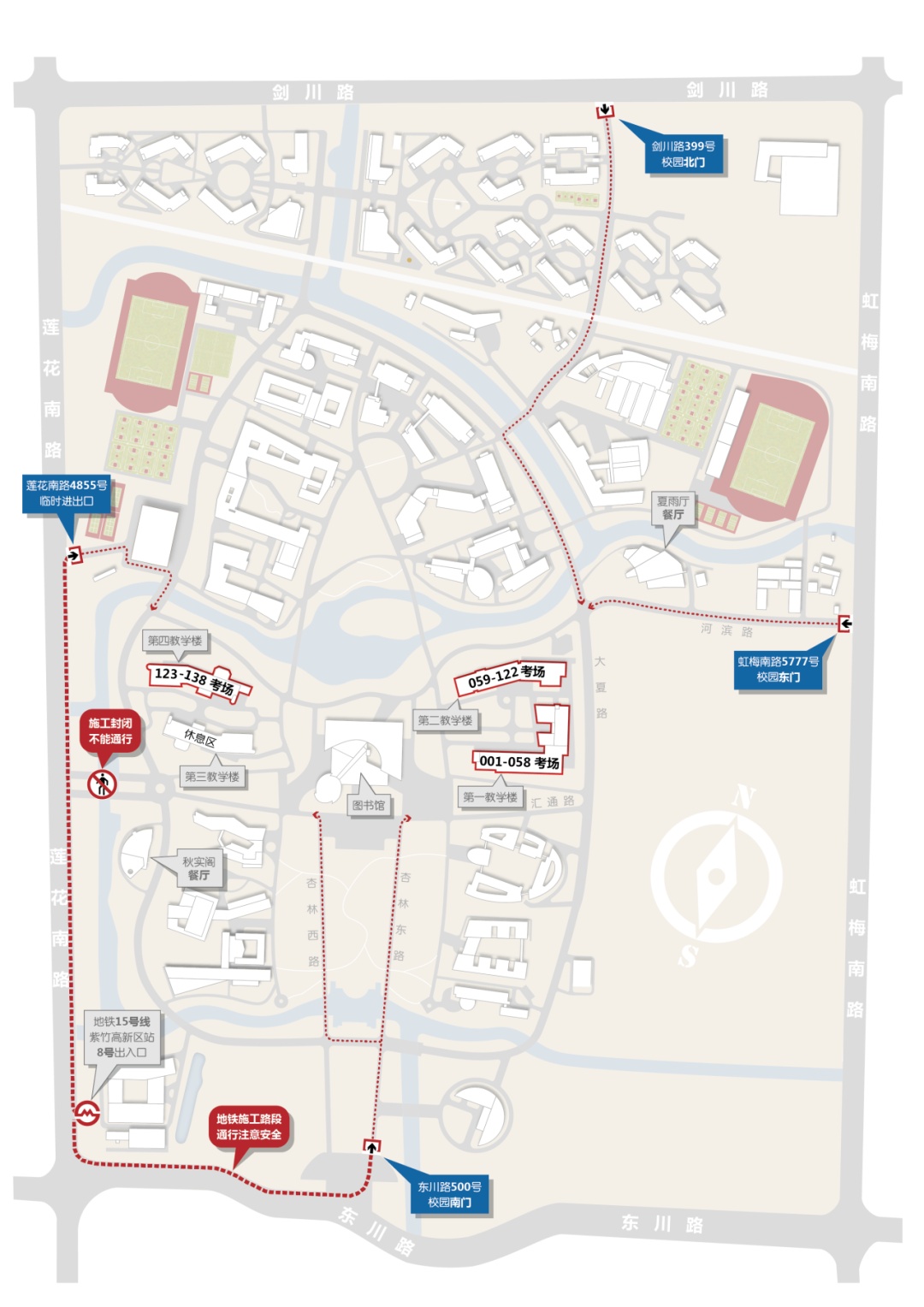 本考点设在华东师范大学闵行校区,考生可从4个校门进入考点: