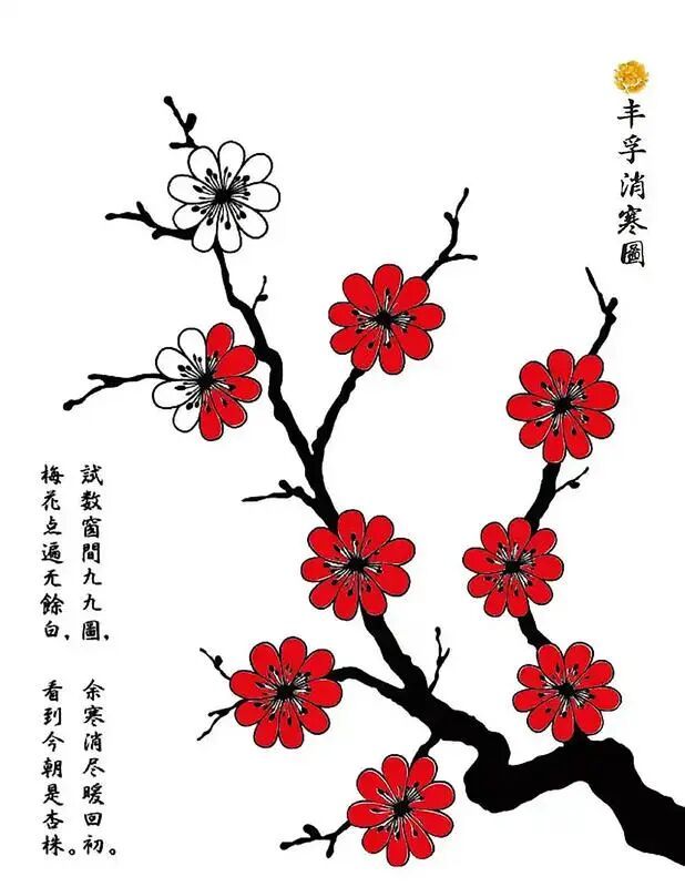 消寒图:常见的有画梅花(每日染一瓣,染完则春深)、写“庭前垂柳珍重待春风”(每字九画,每日写一画)等,富有雅趣。