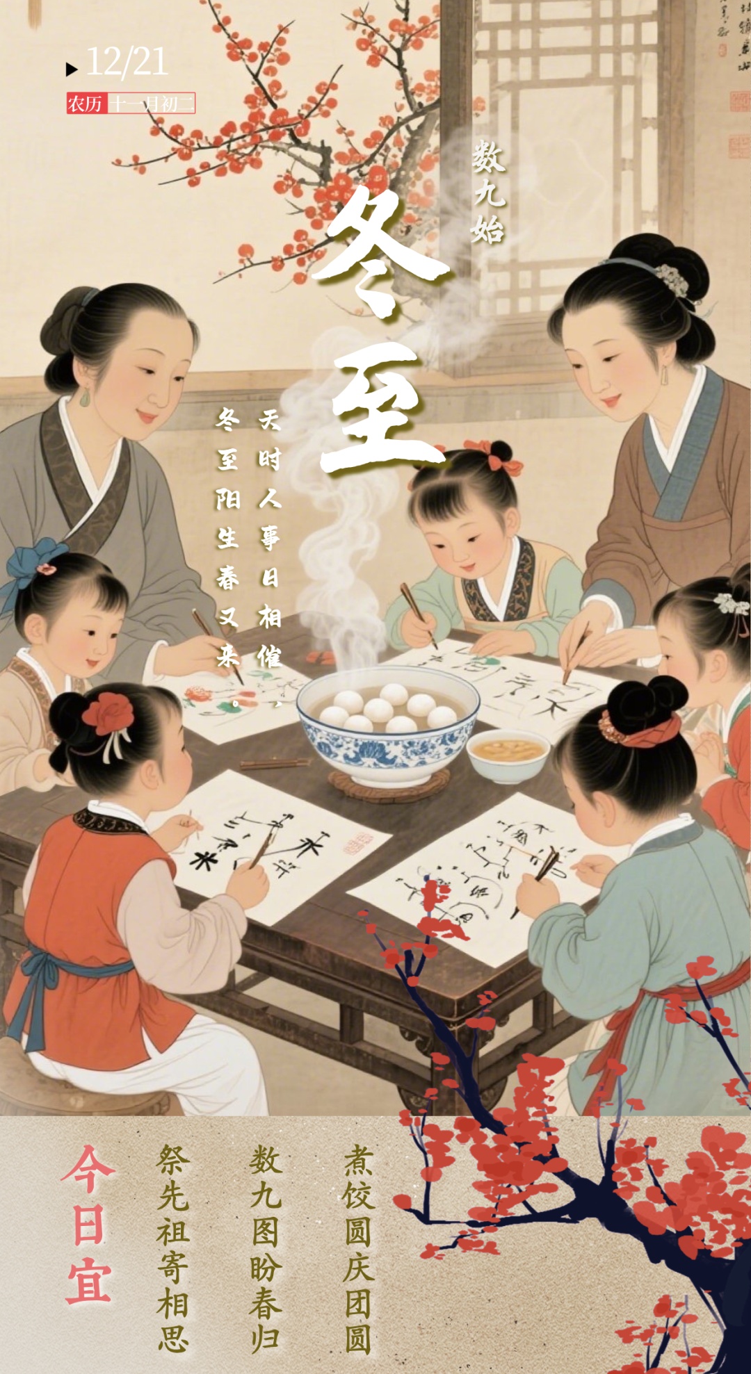 我们看到古人的诗篇,都是站在寒冬,呼唤阳气,渴望春天。杜甫有一首叫《小至》(冬至前一天叫小至)的诗说:“天时人事日相催,冬至阳生春又来。”直接把冬至说成“春又来”,真是一种内心的渴望。而元代的赵孟頫在《题耕织图二十四首奉懿旨撰》的冬至篇说:“冬至阳来复,草木渐滋萌。君子重其然,吾道自此亨。”坦率说,赵孟頫生活的地方,无论是元大都,还是江南湖州,表面上冬至时节根本不存在草木滋萌的情况,冬至新年春意,完全是发自内心的一种想象,也是对于自然规律的深刻体悟。虽然天气寒冷,但感觉是时运亨通。这种心境,是古代传下来的一种充满希望的生活态度,也是对于自然轮转规律的深刻理解。