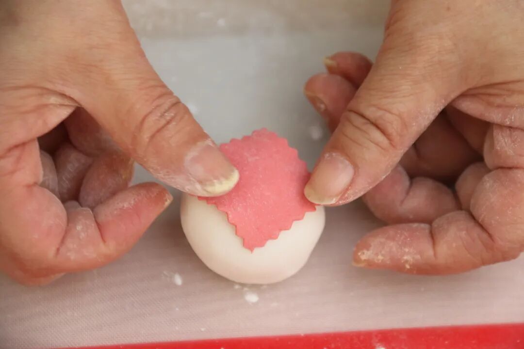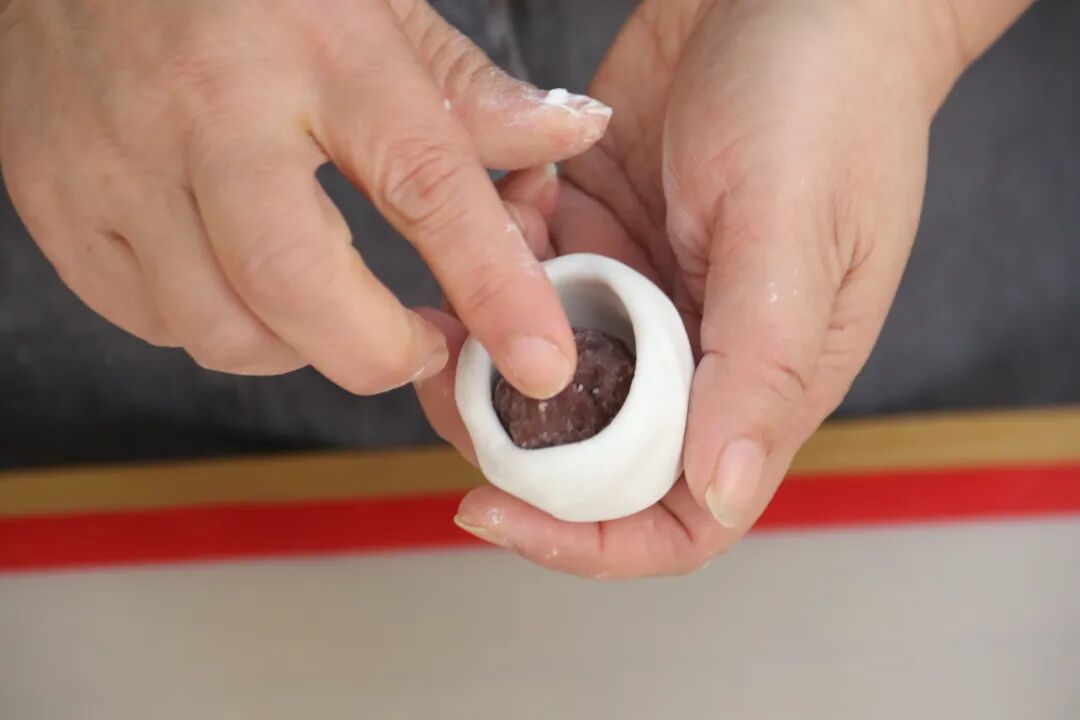 2.将面团分为35-40克左右一个的小面团,在中间包入豆沙馅儿,揉成汤圆。