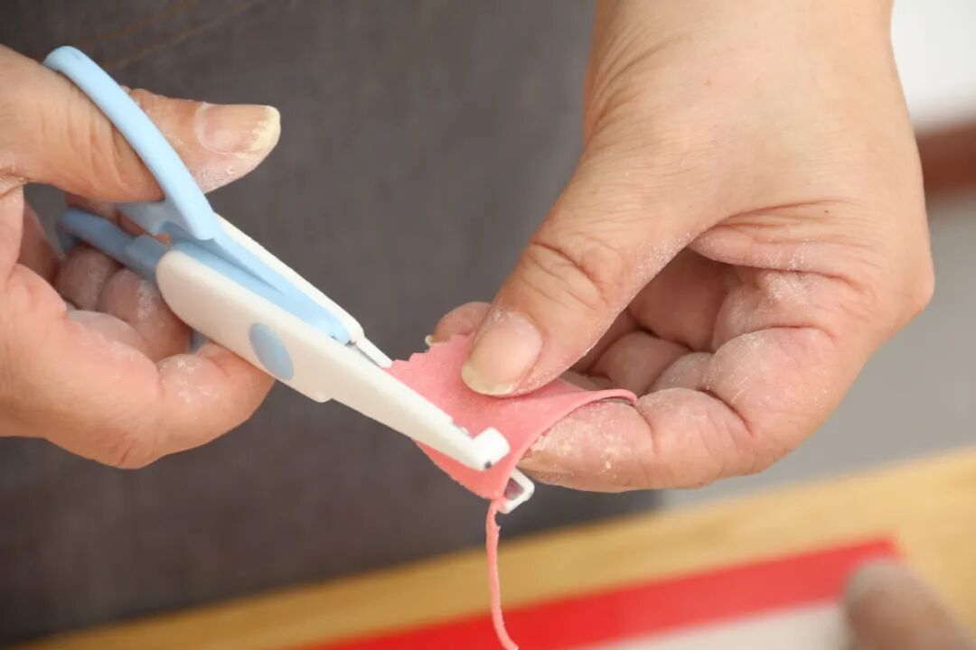 4.切成小方块,用剪刀在四边剪出锯齿形。