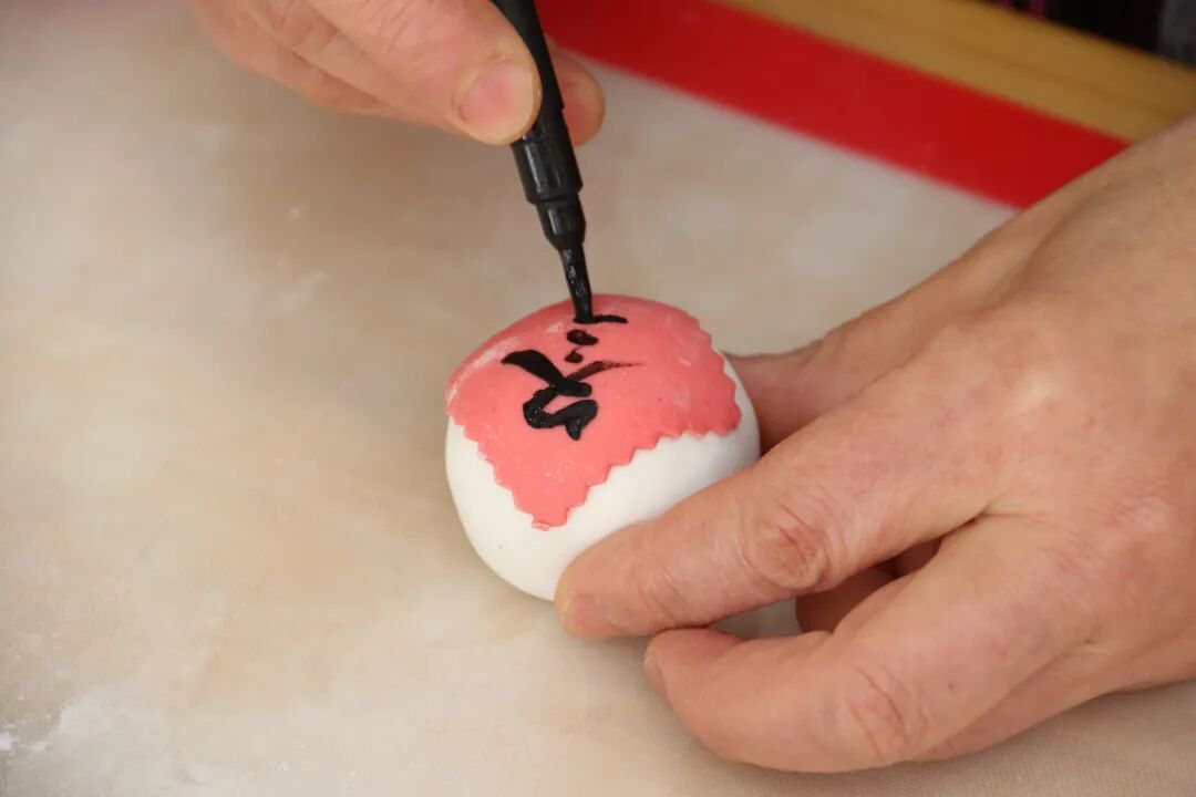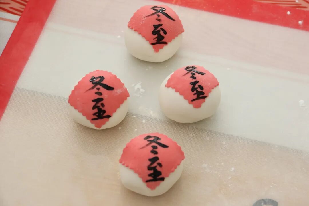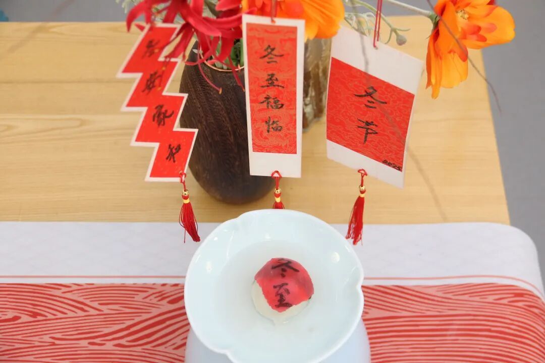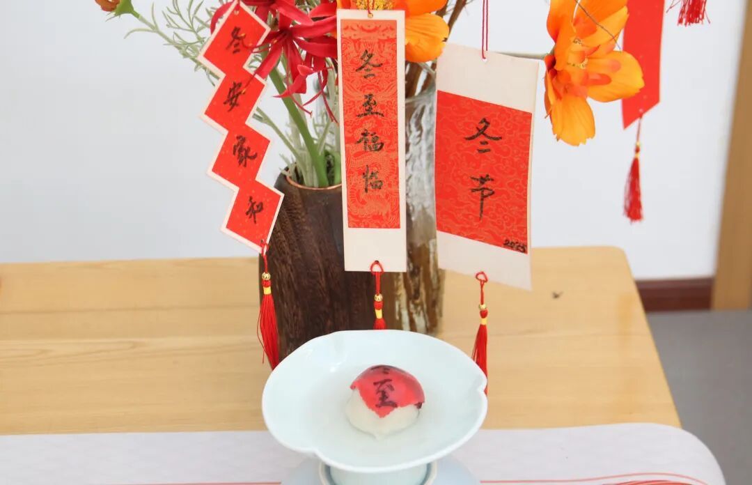 6.用毛笔蘸墨鱼汁,在红色面片上写上“冬至”两个字。