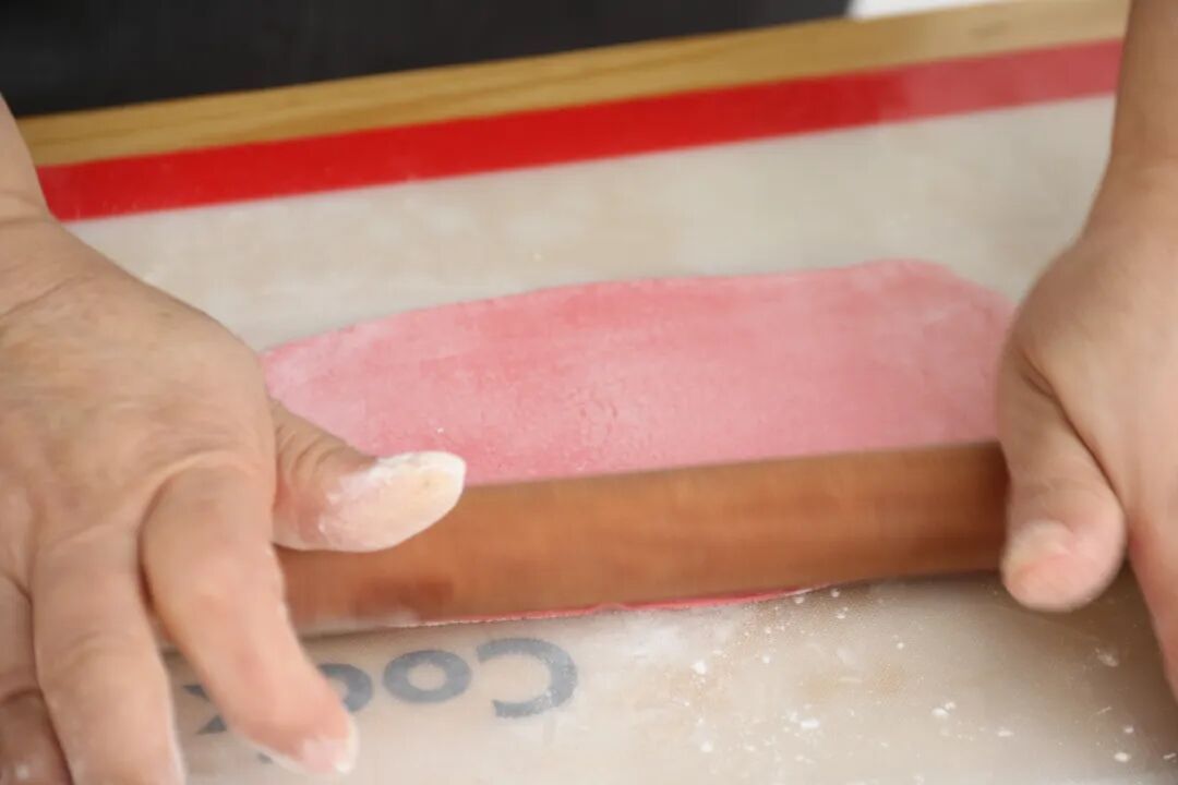 3.从面团中另取出一小块,加入甜菜粉,揉成红色面团,用擀面杖擀成方形薄片。