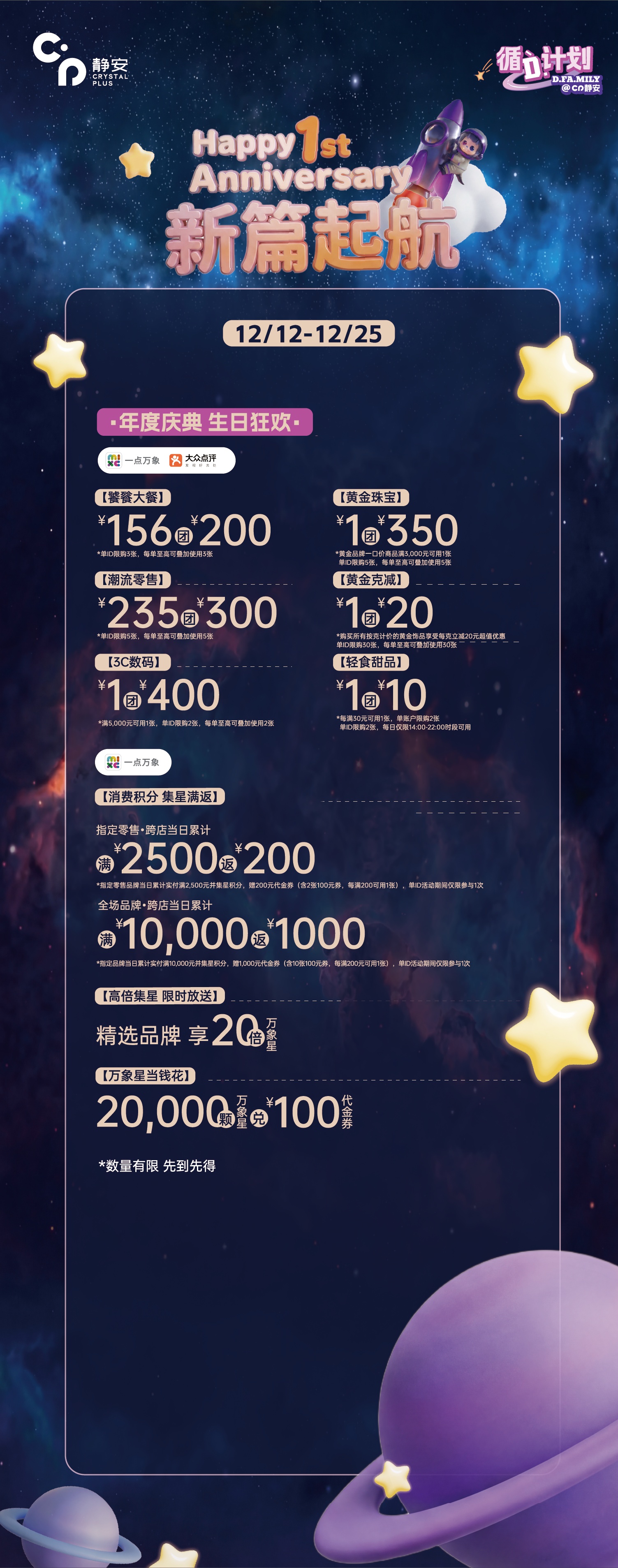 一周年,cp静安以满载礼遇暖心回馈。会员专属抽奖豪礼派送、节日限定礼赠、消费打卡赢代金券、万象星圣诞好礼限时兑——多重惊喜叠加,予你百分百宠爱。