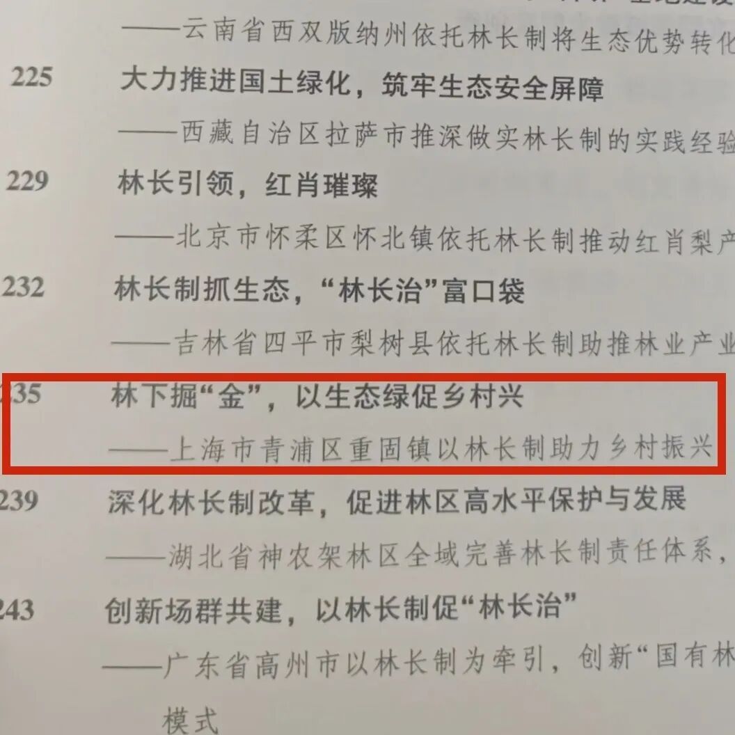 近日,由国家林长制办公室组织编写、中国林业出版社出版的《全国林长制改革典型案例集》正式发行,其中,青浦区报送的《上海市青浦区重固镇林下掘“金”,以生态绿促乡村兴》案例成功入选。