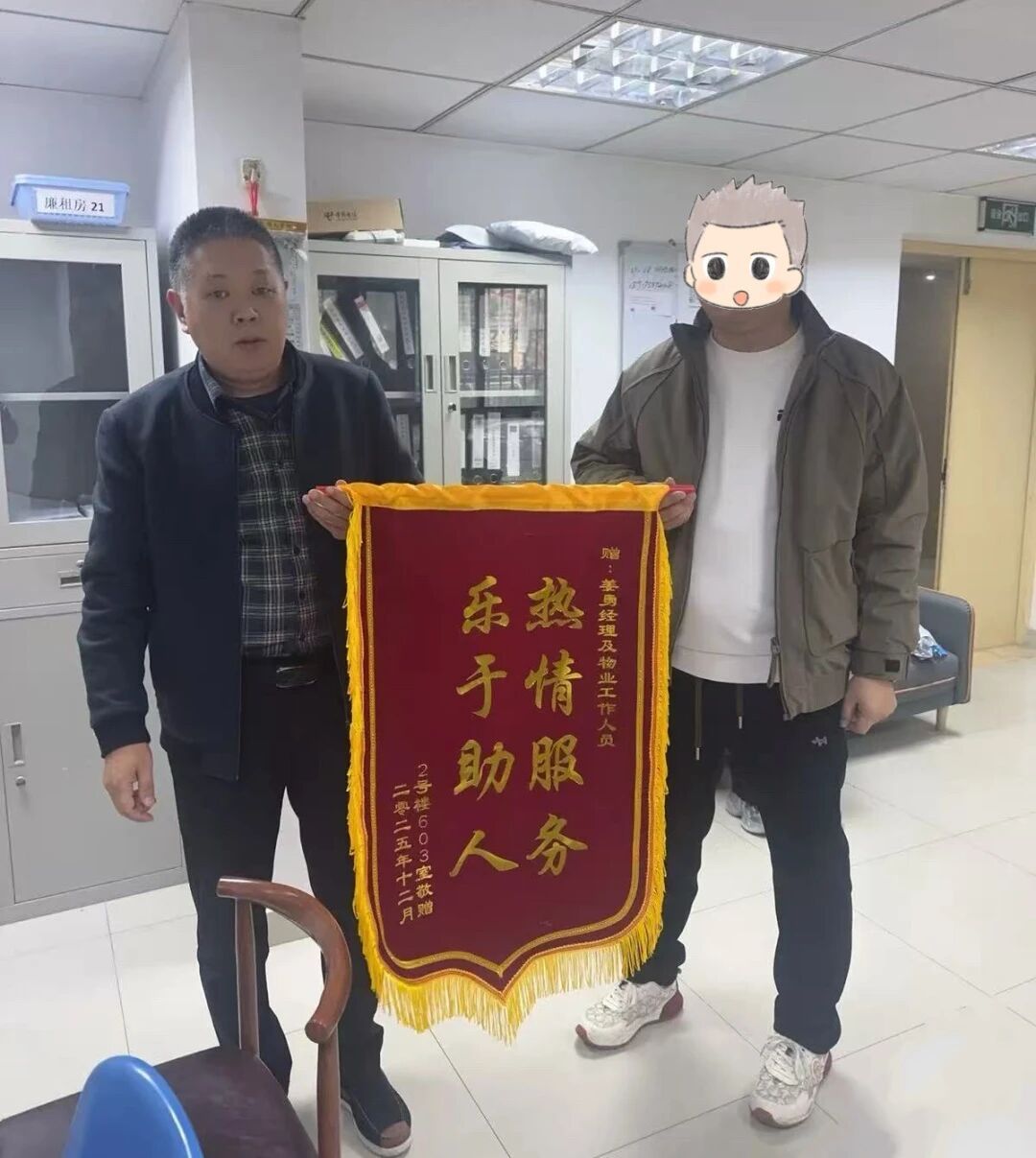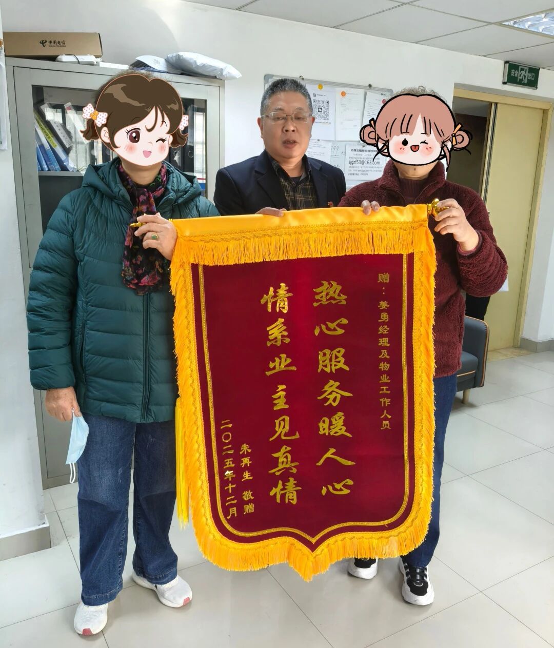 “热心服务暖人心,情系业主见真情”——14个绣制在锦旗上的醒目大字,是住户朱先生的两位姐姐对物业团队最真挚的认可。朱先生因身患小儿麻痹症,语言表达不便,也因此成为物业团队长期牵挂的对象。多年来,无论大事小事,只要朱先生有需要,物业经理姜勇与工作人员总是第一时间上门,全程协助。特别是两位长期为他服务的维修师傅,在与朱先生日复一日的相处中,逐渐建立了深厚的信任与默契。这份长年累月、细致入微的关怀,深深打动了朱先生的两位姐姐。她们感动地说:“物业服务处‘不是亲人,胜似亲人’的照顾,比什么都珍贵。”