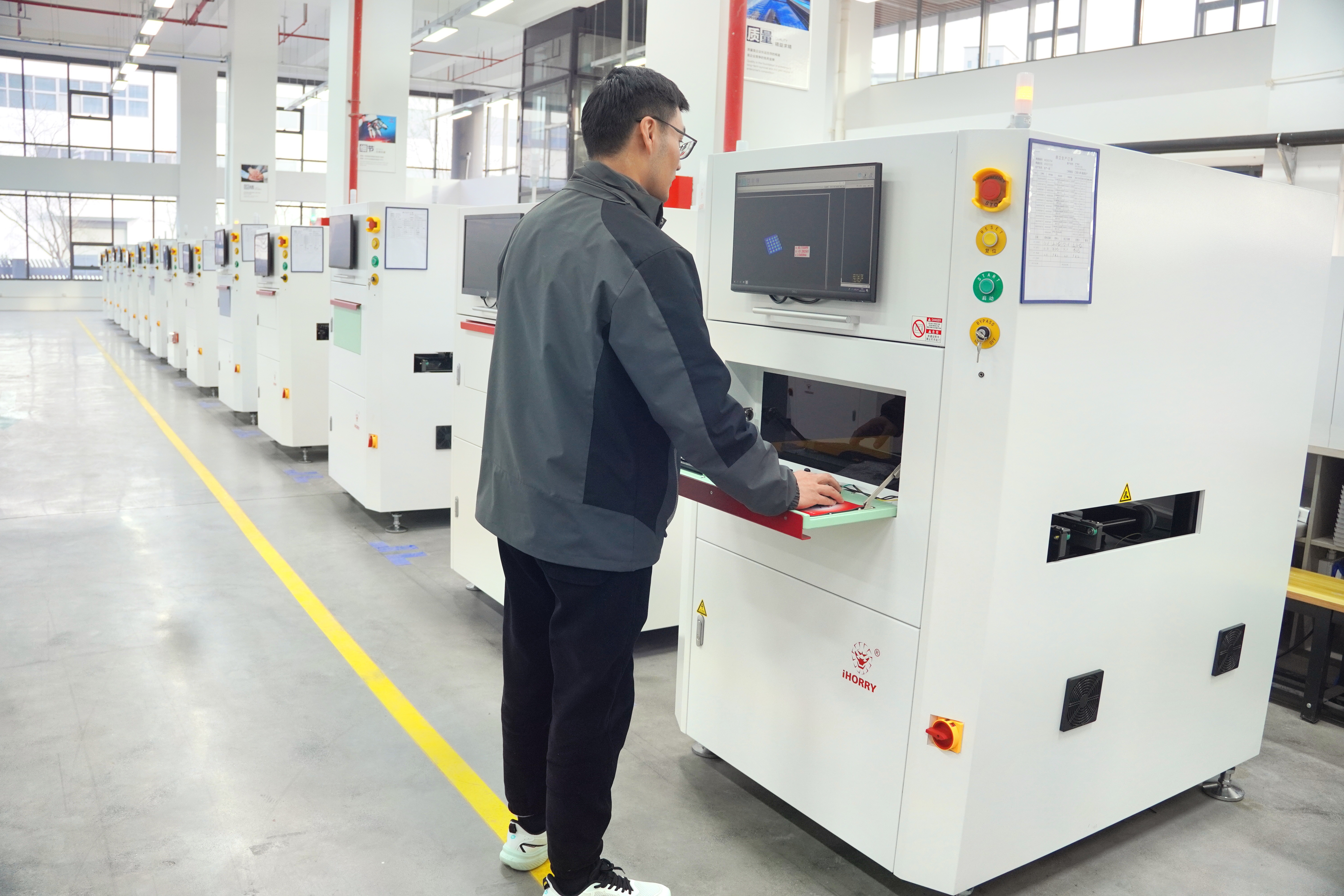 “芯片造出来是‘前道’,而把成千上万个微小芯片和元件精准、高速地贴装到电路板上,做成手机、电脑,这就是我们主攻的‘后道’。”程克林用最直白的方式解释道。在位于东部一楼生产厂区的车间里,一台台赫立自研的aoi、spi等智能检测设备整齐排列,在技术人员的操作下,指示灯规律闪烁,如同沉默而可靠的“超级质检员”,在瞬息间捕捉着电路板上微米级的缺陷。