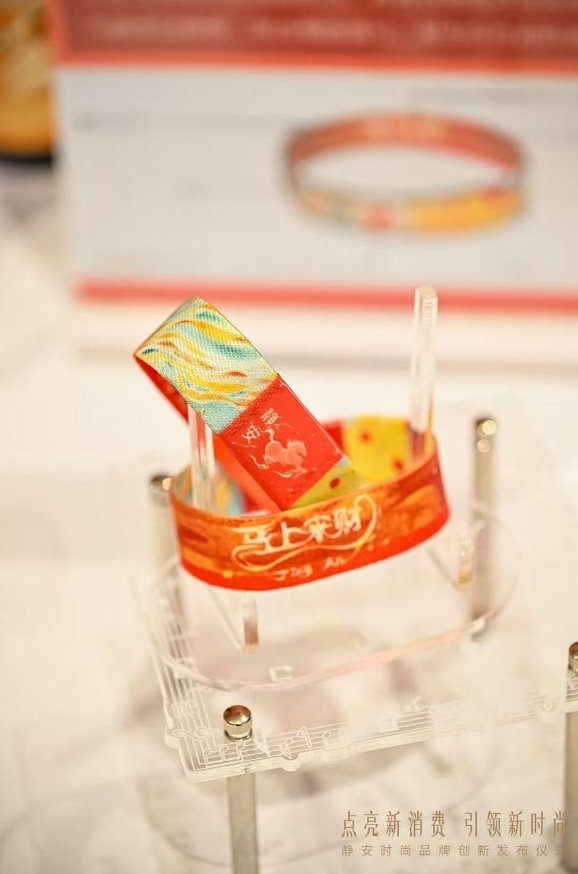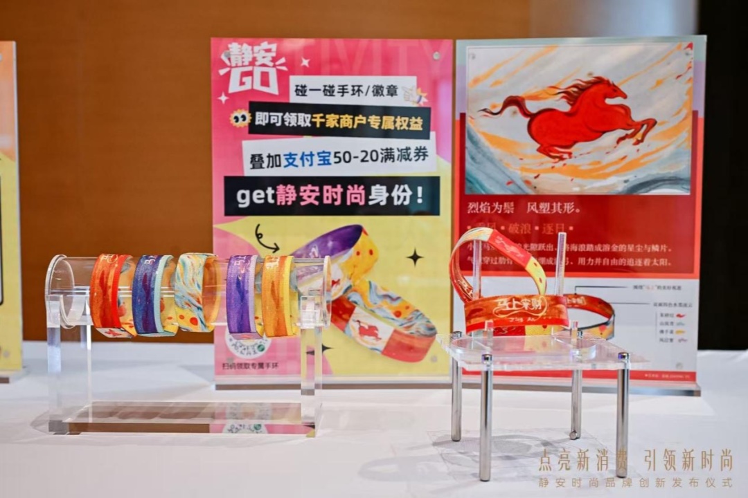 手环上一匹烈焰为鬃的红色骏马昂首逐日,象征着静安消费活力奔涌、一往无前的姿态,也寄托了马年顺遂向前的美好寓意。双面四色水墨流云设计,融合静安标识、海浪、旭日等灵动元素,让它不仅是消费工具,更是承载美好寓意的腕间艺术品。