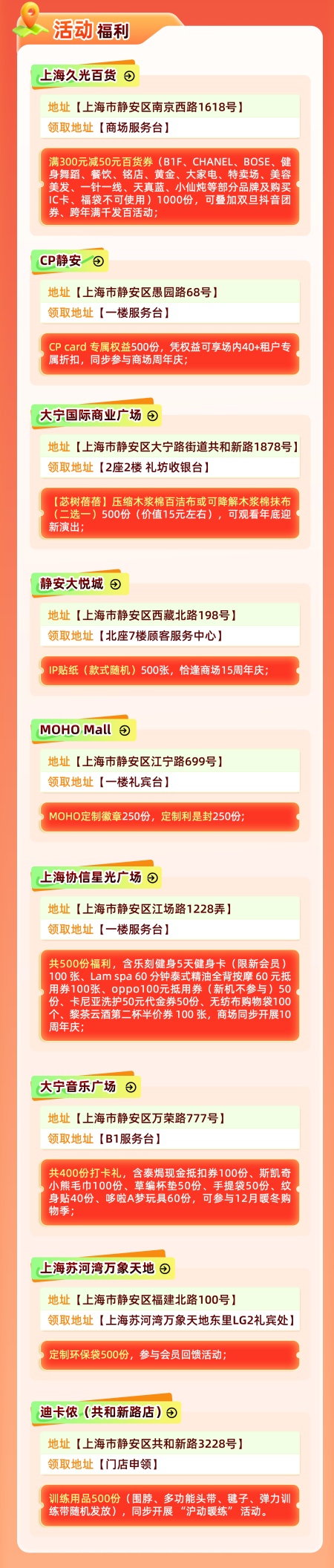 上海久光百货、cp静安、大宁国际商业广场、静安大悦城、moho mall、上海协信星光广场、大宁音乐广场、上海苏河湾万象天地、迪卡侬(共和新路店),推出仅限元旦期间(截至1月11日)的定制好礼,只要到对应商场打卡并注册会员,就能领取艺术联名手环及专属好礼(艺术联名手环及专属好礼均为活动期间每个id限领1次),一环解锁多重礼遇,让每一次消费都物超所值。