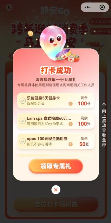 核心权益:每月可在支付宝搜索“静安go”领取1张满50减20元优惠券,7日内有效;打卡九家商场可额外领取特别权益及福利;