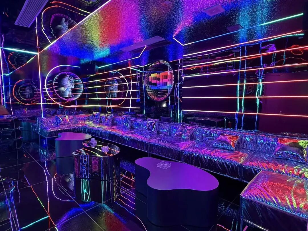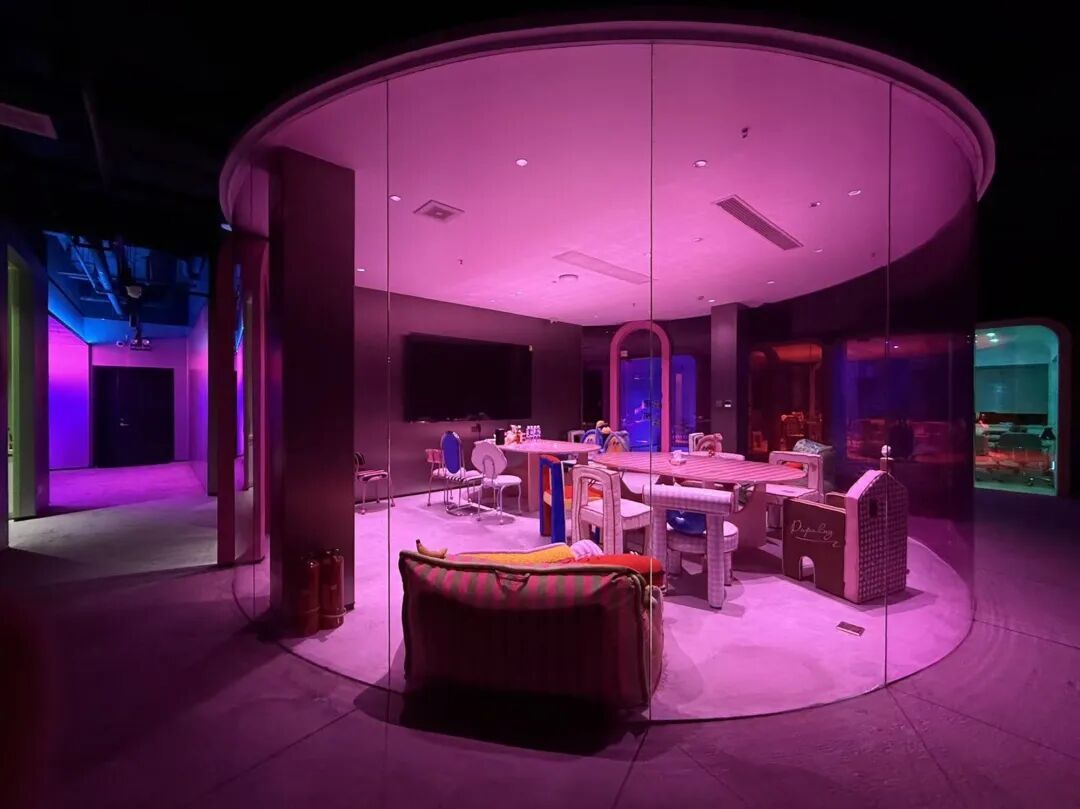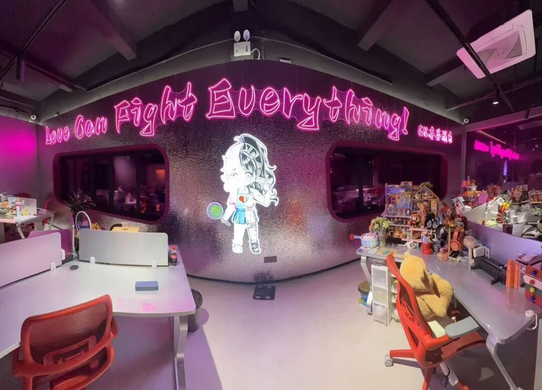 这里没有传统格子间的压抑,取而代之的是游乐场、ktv、游戏社交区,甚至有洗澡间。赛博朋克的霓虹灯光撞上复古的多巴胺配色,空气里弥漫着一种“及时行乐”的躁动。这不仅是一家mcn机构的总部,更像是一个线下社交互动的“巨型实验室”。