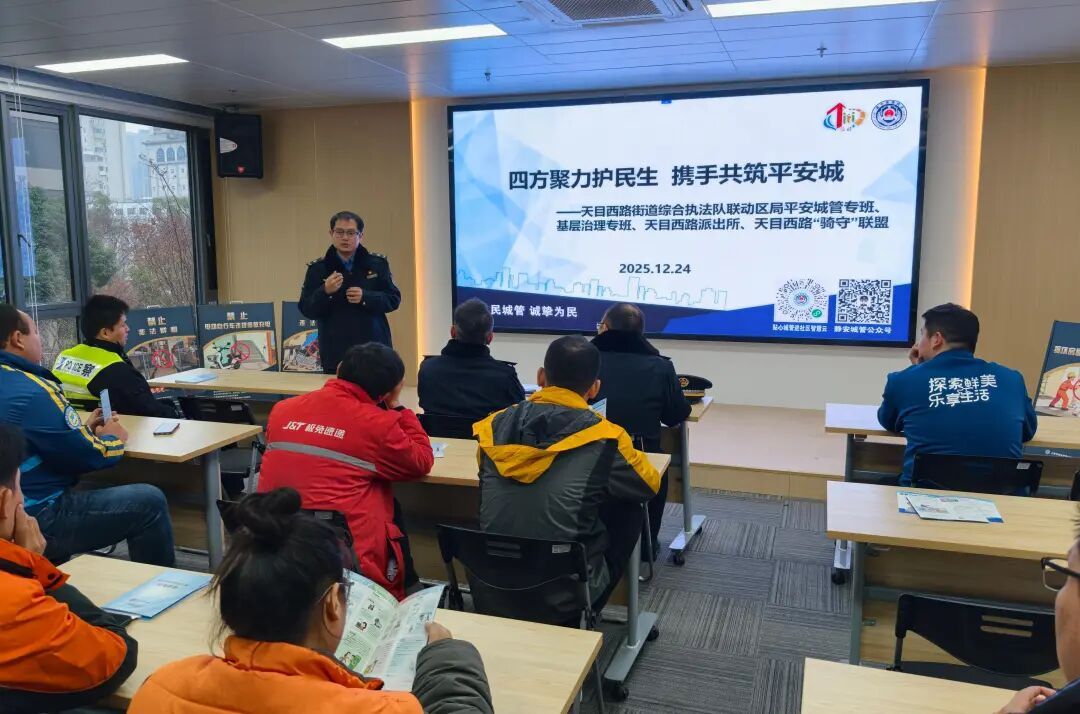 近日,为深入贯彻市委、市政府关于创新社会治理、深化平安建设的部署要求,积极营造平安建设“人人知晓、人人参与”的浓厚氛围,天目西路街道综合执法队紧扣市局年度工作安排以及街道平安建设的具体方案,锚定局“平安蓝盾”系列行动目标,联动区城管执法局平安城管专班、基层治理专班,天目西路街道派出所及街道“骑守”联盟,于苏河人才综合网格工作站组织辖区快递外卖行业负责人,开展“四方聚力护民生 携手共筑平安城”主题宣传活动。