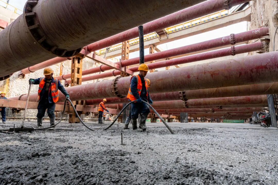 近期,市域嘉闵线17标七莘路站建设取得新进展。随着主体结构最后一块底板混凝土浇筑完成,车站基坑顺利封底,全面进入主体结构回筑施工阶段。
