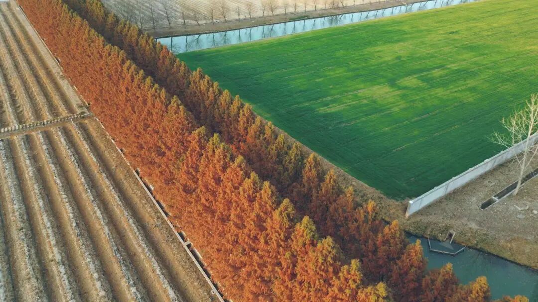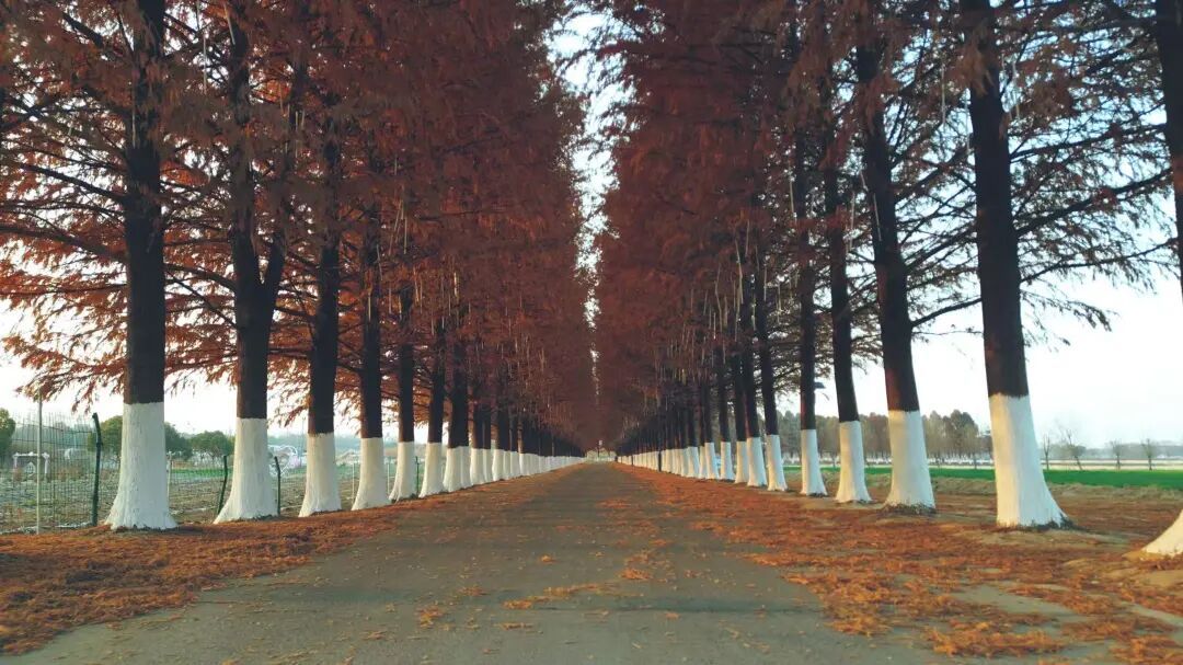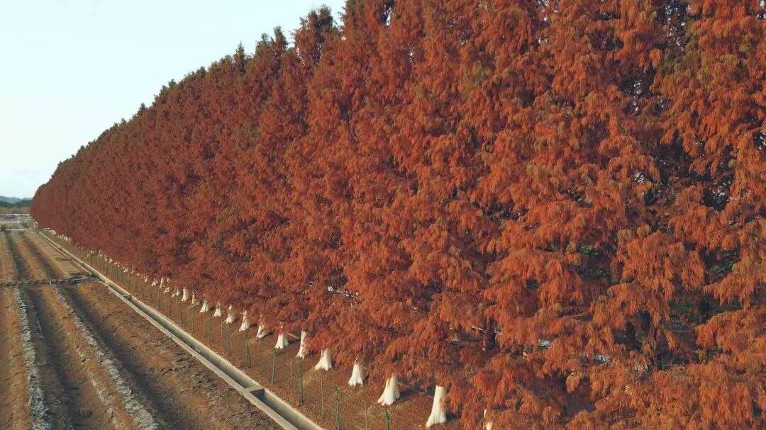 从高空俯瞰,金黄、橙红与深棕交织,两排杉树整齐列队,百米杉林宛如一幅暖色油画,枝叶在上空交织成天然拱廊,与一旁翠绿的田野相映成趣。