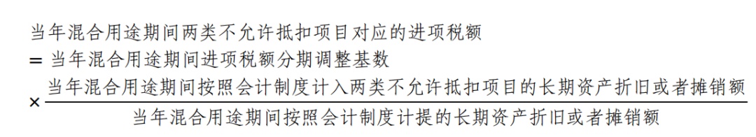 第八条 纳税人取得长期资产,专用于五类不允许抵扣项目后发生用途改变,专用于一般计税方法计税项目,或者既用于一般计税方法计税项目,又用于五类不允许抵扣项目的(以下统称混合用途),按照下列公式在用途改变的当月计算可抵扣进项税额: