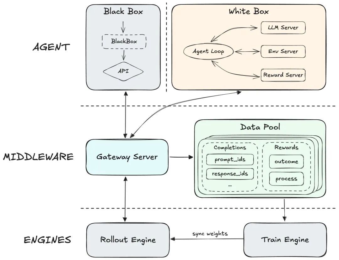 为了实现真正可扩展的架构,我们不再局限于具体的 agent,而是转向了通用的抽象层设计,将 agent 的执行逻辑与底层的训推引擎彻底解耦。我们的 rl 系统由 3 个核心模块组成: