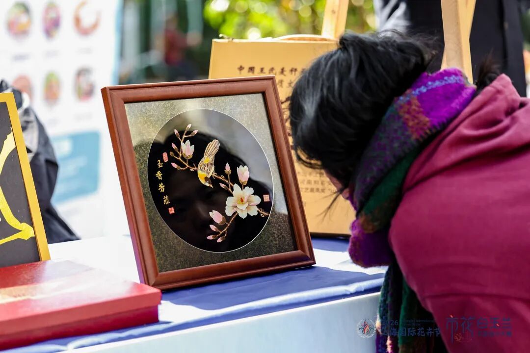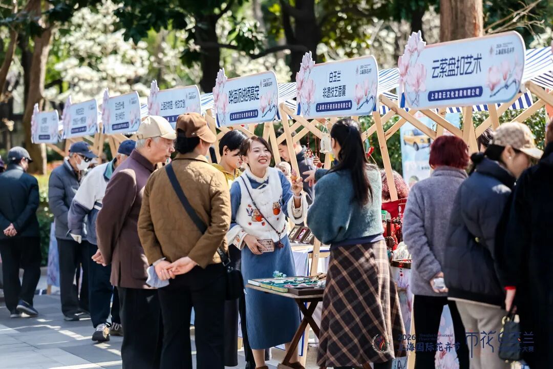 活动的热忱蔓延至户外的“玉兰雅集·创意绽放”主题市集,近二十个特色摊位汇聚成人气盎然的文创聚落,空气中仿佛都浸润着玉兰的清雅与创作的活力。文创展销区内,玉兰主题的盘扣胸针成为爆款,精致的手工盘扣勾勒出白玉兰的绽放姿态,搭配海派布艺的巧思,尽显江南雅致与海派风情;玉兰香囊与香氛摊位前,天然香料调和的清雅玉兰香吸引着市民驻足,大家在亲手制作的过程中感受市花的芬芳;花艺、上海动物园等特色摊位同样人气高涨,让市民将白玉兰的美好定格在方寸之间。