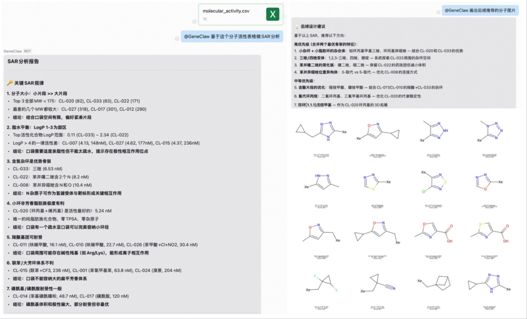 发送分子活性表格,geneclaw自动提炼构效关系规律、给出后续分子设计建议,并画出推荐片段结构。