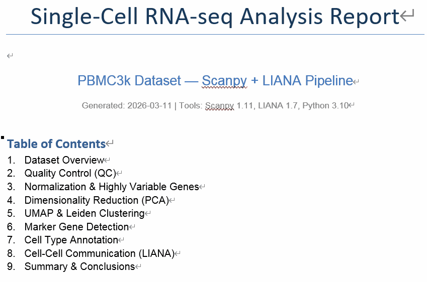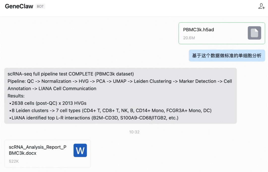 上传h5ad数据文件,geneclaw自动完成从qc到细胞通讯的完整 scrna-seq分析,输出含图表的专业报告。