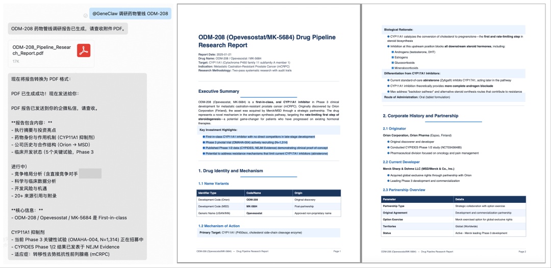 输入药物代号,geneclaw自动检索并生成涵盖作用机制、临床进展、竞争格局的完整管线调研pdf。