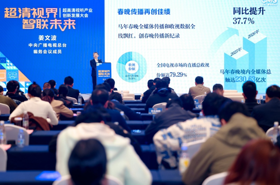 姜文波在大会现场首次揭秘《中央广播电视总台2026春晚科技创新应用》,分享总台作为行业技术先行先试者,在超高清视听内容创制与场景落地的宝贵经验,展现了国家级平台的技术标杆力量。