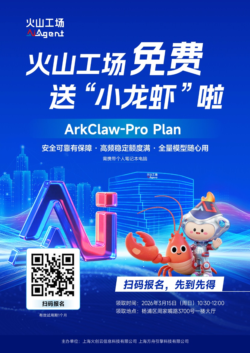 为加速智能体技术落地应用,火山工场联合杨浦科创集团即日起面向用户推出arkclaw pro plan专业版限时试用。