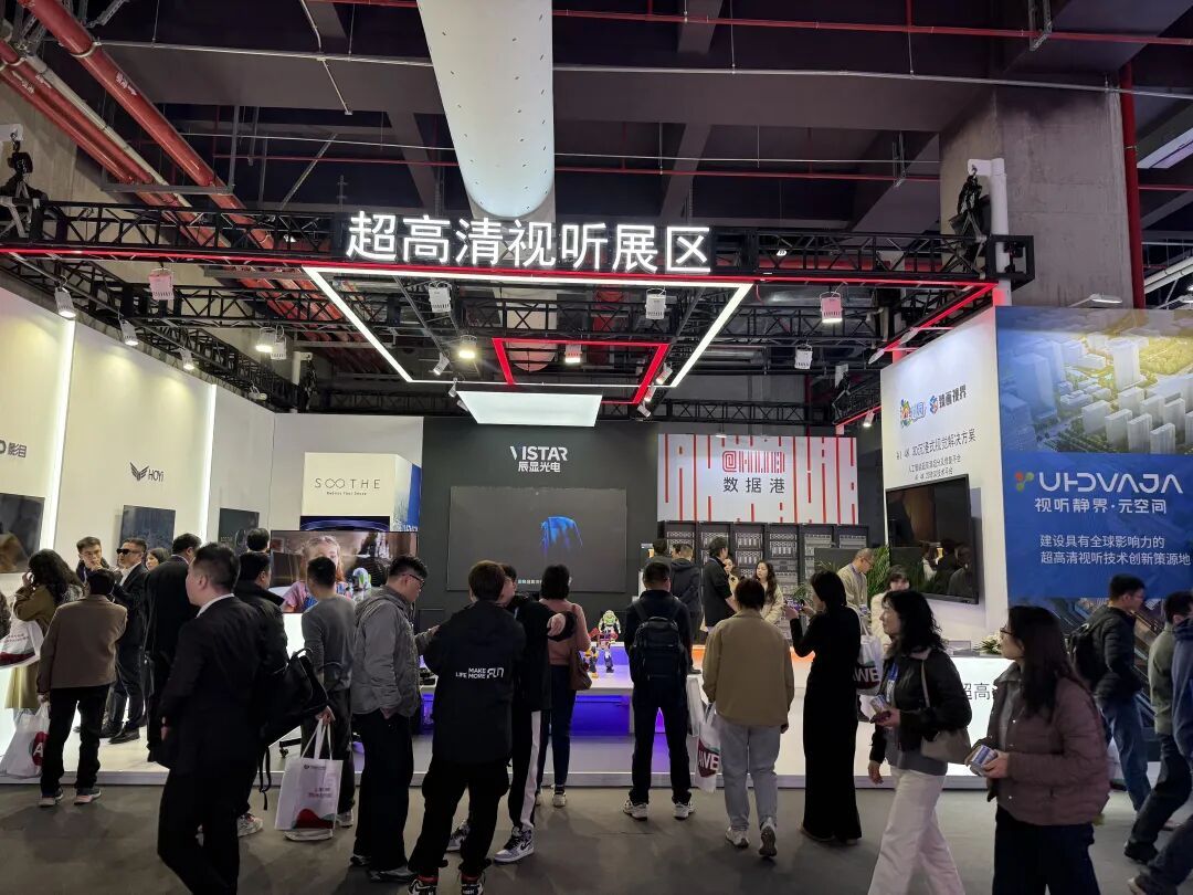 3月12日开幕首日起,位于东方枢纽展区a馆的超高清视听展区便持续保持高涨人气。相邻而设的“视听静界·元空间”展台与“视听静界·π空间”展台吸引来自全球各地的专业观众、采购商、投资机构及科技爱好者,展区内始终人头攒动。