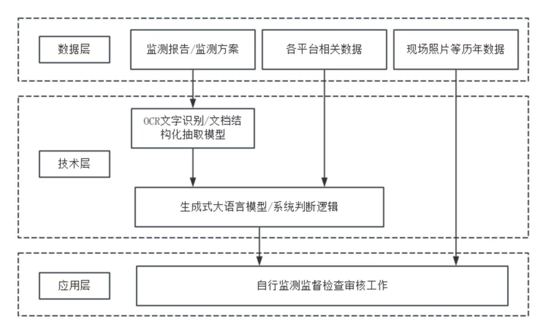 采用数据层—技术层—应用层三级架构:数据层整合企业监测报告/方案、四大平台数据及历年检查数据;技术层通过ocr与结构化抽取模型提取关键信息,结合大语言模型和预设逻辑完成智能比对审核;应用层落地自行监测监督检查审核工作,实现问题预警与闭环处置。