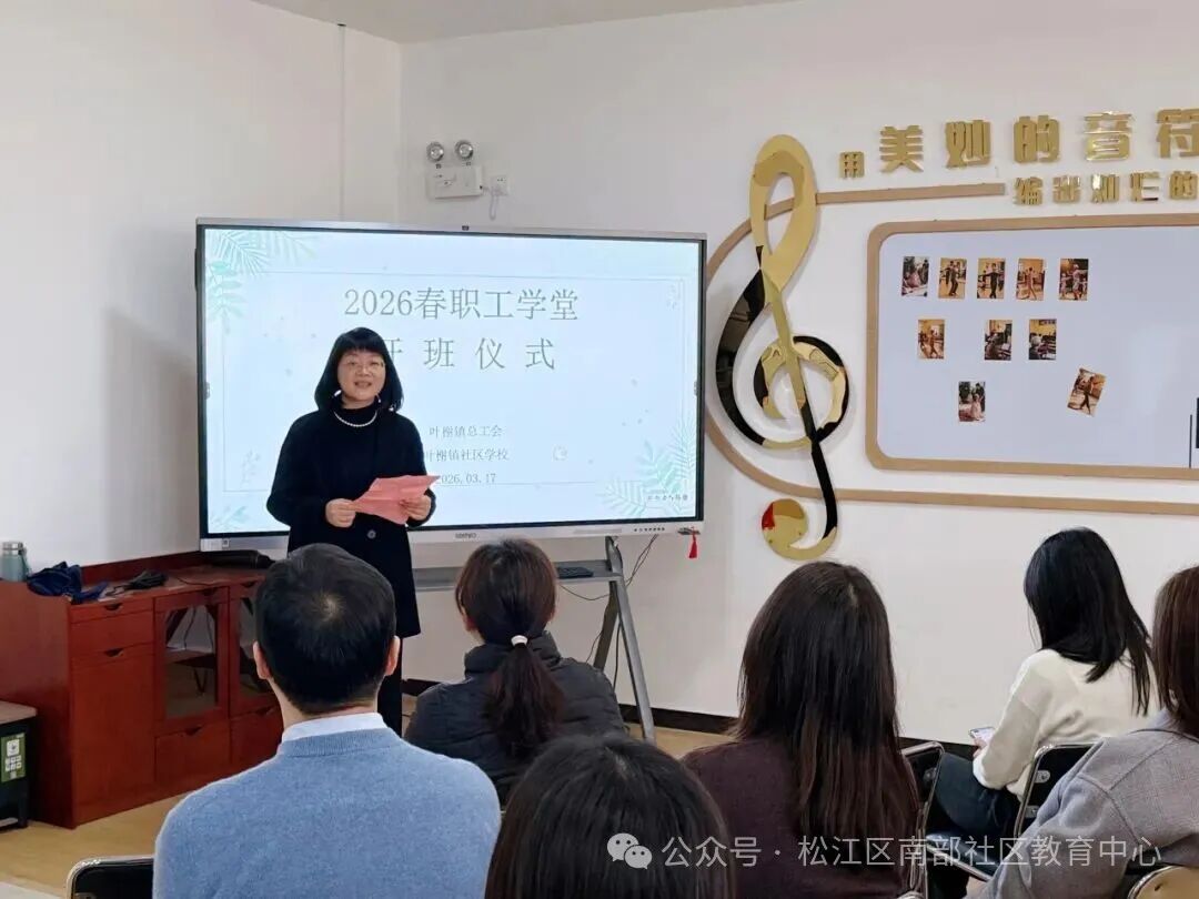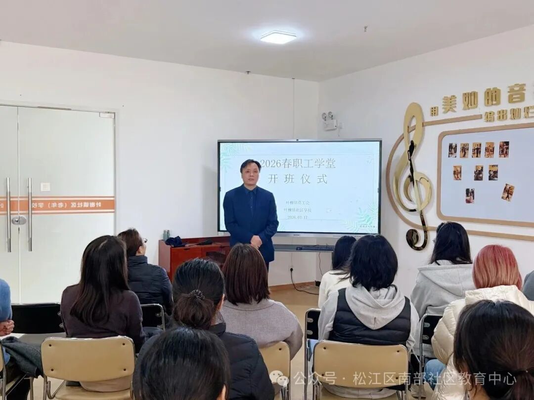 叶榭镇总工会主席作动员讲话。她强调,职工学堂是工会为职工服务的具体行动,是联合社区学校打造的职工成长平台,兼顾技能提升与精神文化需求。她介绍,三月起将开设民族舞、八段锦、茶艺、非洲鼓、民族舞等特色课程,希望职工们合理安排时间参与学习,实现个人与职业双向赋能,同时预祝学堂开班圆满成功。