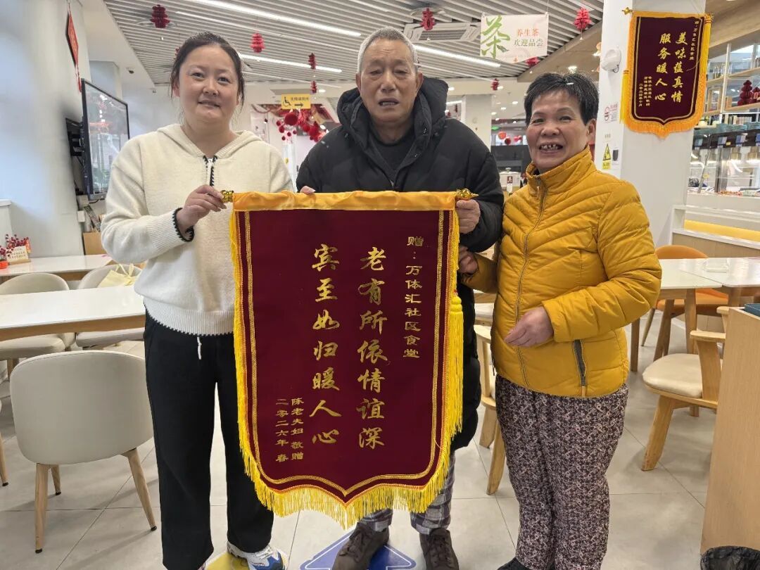 “孩子们不在身边,每天最盼的就是来食堂吃口热乎饭。这面锦旗,是我们老两口的一点心意。”家住徐家汇街道的陈老伯为万体汇社区食堂送来锦旗,话语里满是感激。