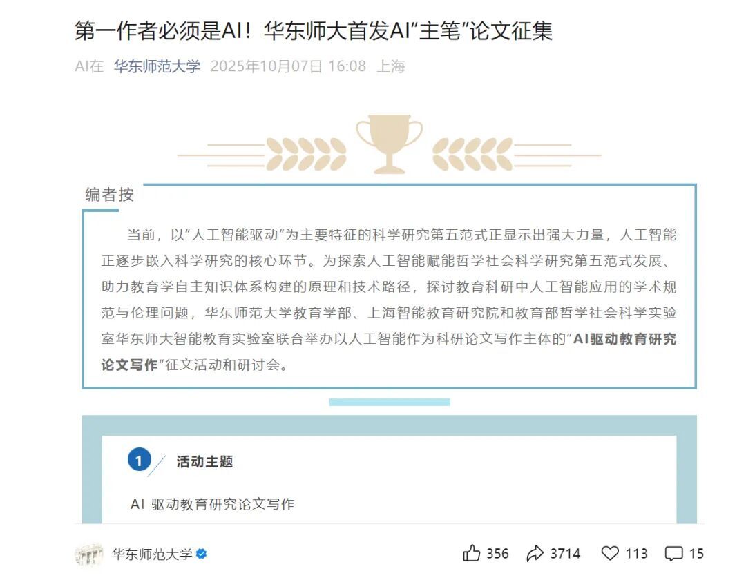 “第一作者必须是ai!”2025年,华东师范大学发起以ai为科研论文写作主体的“ai驱动教育研究论文写作”征文活动,旨在探讨ai赋能的未来教育新生态,特别是ai赋能的未来学习、未来课堂、未来教师、未来学校和未来科研。征文通知一经发布便引发热议。第一教育持续关注此事进展,曾陆续发布两篇报道——