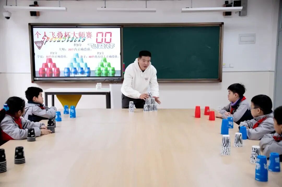 学校还开发了具有校本特色的“飞叠杯”等体育与健康课程,将手眼协调、反应速度与节奏感训练融入趣味活动中。作为对传统体育教学的创新补充,“飞叠杯”不仅增强了课程的多样性与参与性,也有效提升了学生的专注力、精细动作能力和团队协作意识。