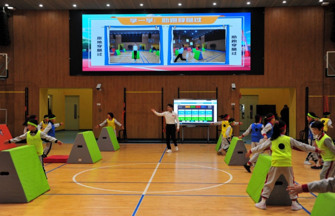 在课程设计上,学校遵循“知识+基本技能+专项技能”的理念,将体育知识、体能训练与技能培养紧密结合:黄辉龙老师运用光电球、ai数字人等工具,将体能训练融入“颜色拍拍乐”“抓尾巴”等趣味游戏中,让学生在互动体验中提升协调性与位移速度;张佳一纯老师巧妙联结韵律教学融入课程,以“舞步修炼”“节奏挑战”“舞团比拼”为任务主线,提升学生节奏变速状态下手脚协调性;周梓欣老师以“海岛抢险”为主题,设计了“踏浪登陆”“探雷排障”等趣味游戏,锻炼学生的灵敏度和协调能力;魏振华老师设计“小小消防员”主题课程,巧用毛巾设计“绳索速降”等练习,锻炼了学生的协调性与肌肉力量。