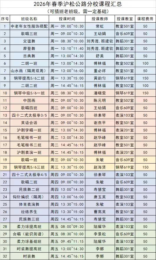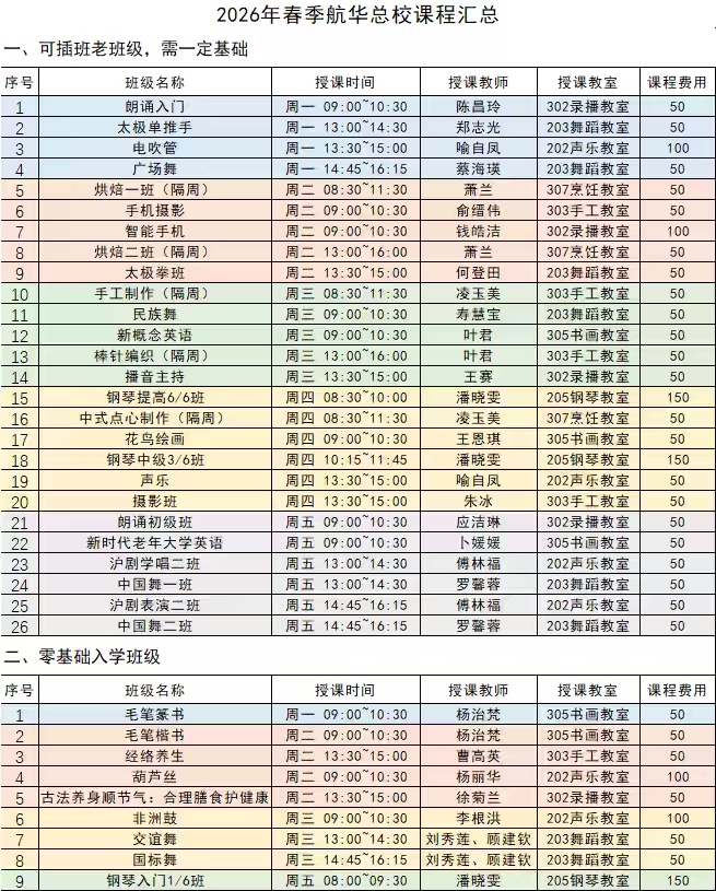 今年春季,航华校区开设了46个课程班级,涵盖文化艺术、生活技能、健康养生等多个领域,既有传统的书法、国画、声乐,也有时尚的电吹管、烘焙、茶艺,层次丰富、品类多样。
