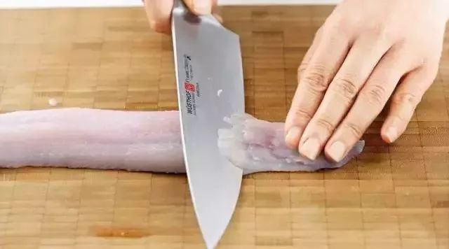 1.草鱼平放在砧板上,从颈部斜刀切下,待刀刃碰到鱼脊骨,则将刀刃沿脊骨平着片向尾部,取下一片鱼肉;