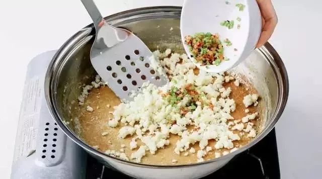 4.不停地翻炒锅中的豆浆蛋汁,待慢慢凝固成松散的粒状,把芥蓝丁、干虾仁丁倒入锅中翻炒几下出锅。
