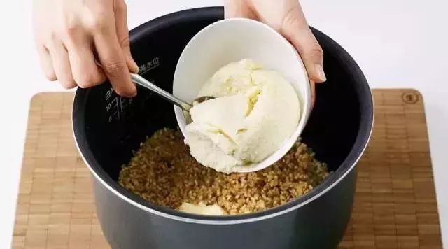 3.和入豆浆,搅拌均匀。启动电饭煲的煮饭功能。待糙米饭煮好后不要马上打开锅盖,稍焖一会儿最好。